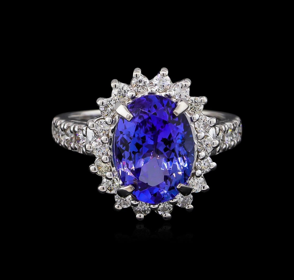 One electronically tested 14KT white gold lady's cast fashion ring with a basket halo with a bright polish finish. The featured lady's ring has a shank measuring 2.05 millimeters wide. Identified with markings of "K14". Condition is new, good workmanship. Containing: One prong set oval modified brilliant cut natural tanzanite, measuring 11.64 x 8.52 x 5.68mm, approximate weight of 3.94ct., clarity is slightly included, type I, medium dark, moderately strong, violetish blue color, (GIA vB 6/4), cut is good. Transmitting light with no distortion, transparent. Colored gemstones are presumed to have been subjected to commonly used enhancement processes. Graded in the setting. Eight prong set round brilliant cut diamonds, measuring 2.10 - 2.00 x 1.27mm (depth est.) approximate total weight of 8 Stones = 0.26ct. Graded in the setting. Clarity: SI-1 to SI-2. Color: H - I. Cut Good Eighteen prong set round brilliant cut diamonds, measuring 2.00 - 1.90 x 1.17mm (depth est.) approximate total weight of 18 Stones = 0.49ct. Graded in the setting. Clarity: SI-1 to SI-2. Color: H - I. Cut Good. Total Weight of Colored Stones 3.94ct. Total Weight of Diamonds 0.75ct. Total Weight of Ring 6.10gm. GAS Appraised at $9,030.00.