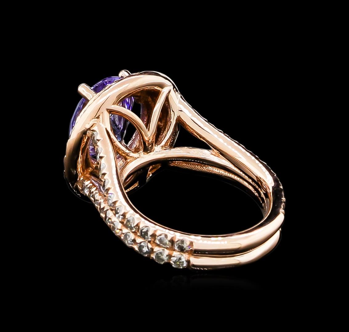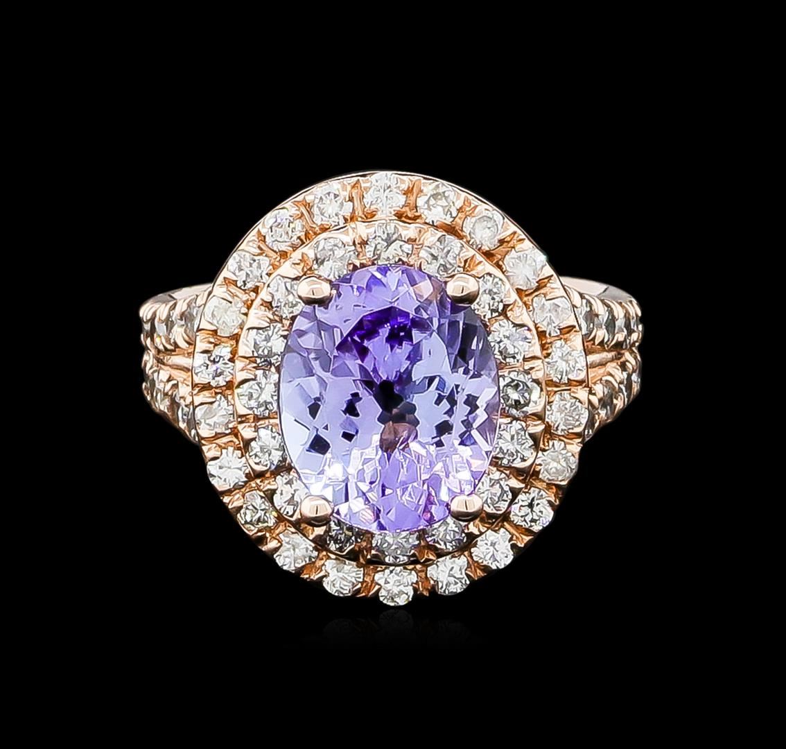 One electronically tested 14KT rose gold ladies cast tanzanite and diamond ring with a bright polish finish. The featured tanzanite is set within tiered diamond bezels supported by diamond set split shoulders, completed by a four millimeter wide band. Condition is new, good workmanship. Containing: One prong set oval mixed cut natural tanzanite, measuring 10.60 x 8.80 x 5.72mm, 5%. bulge factor, approximate weight of 3.94ct., clarity is eye clean, type I, medium, very slightly grayish, violet color, (GIA V 5/3), cut is good. Transmitting light with no distortion, transparent. Graded in the setting. Tanzanite is a very rare gemstone that is only found in the country of Tanzania. Originally discovered in 1967. Tiffany & Company, named the stone Tanzanite. It is found in the Usumburu Mountains that border the Umba Valley of northern Tanzania. Tanzanite occurs in gray, brown, violet, blue, reddish-purple, & green. The gem is interesting because of its exceptional pleochroism. Rotated in different directions a tanzanite will exhibit multiple changes of color. Tanzanite has a low tolerance to ultrasonic cleaning, and should not be cleaned using this method. Seventy-Eight prong set round brilliant cut diamonds, measuring 2.00 - 1.80 x 1.14mm (depth est.) approximate total weight of 78 Stones = 2.06ct. Graded in the setting. Clarity: SI-2 to I-2. Color: G - I. Total Weight of Colored Stones 3.94ct. Total Weight of Diamonds 2.06ct. Total Weight of Ring 9.27gm. AIG Appraised at $12,970.00.