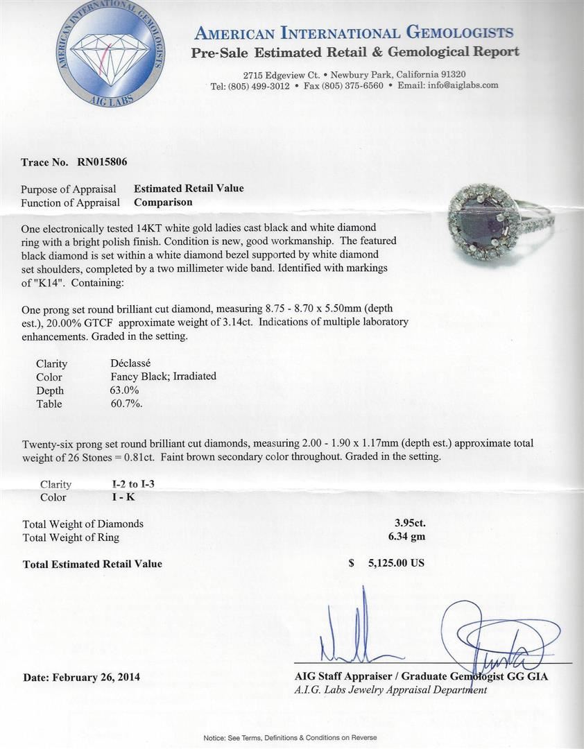 One electronically tested 14KT white gold ladies cast black and white diamond ring with a bright polish finish. Condition is new, good workmanship. The featured black diamond is set within a white diamond bezel supported by white diamond set shoulders, completed by a two millimeter wide band. Identified with markings of "K14".Containing:One prong set round brilliant cut diamond, measuring 8.75 - 8.70 x 5.50mm (depth est.), 20.00% GTCF approximate weight of 3.14ct. Indications of multiple laboratory enhancements. Graded in the setting. Clarity: Declasse. Color: Fancy Black; Irradiated. Depth: 63.0%.Table: 60.7%.Twenty-six prong set round brilliant cut diamonds, measuring 2.00 - 1.90 x 1.17mm (depth est.) approximate total weight of 26 Stones = 0.8let. Faint brown secondary color throughout. Graded in the setting. Clarity: I-2 to I-3.Color: I - K. AIG Appraised at $5,125.00.