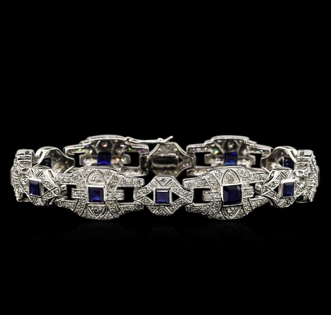 One electronically tested 18KT white gold lady's combination cast & assembled vintage bracelet with a tongue clasp with foldover safety with a bright polish with milgrain detailing finish. Identified with markings of "18K". Condition is new, good workmanship. Containing: One bezel set square emerald standard step cut natural blue sapphire, measuring 5.10 x 5.00 x 3.80mm, approximate weight of 1.00ct., clarity is eye clean, type II, dark, moderately strong, blue color, (GIA B 7/4), cut is very good. Colored gemstones are presumed to have been subjected to commonly used enhancement processes. Graded in the setting. Eleven bezel set square standard step cut natural blue sapphires, measuring 3.60 x 3.50 x 2.20mm, approximate total weight of 2.95ct., clarity is eye clean, type II, medium dark, moderately strong, blue color, (GIA B 6/4), cut is good. Colored gemstones are presumed to have been subjected to commonly used enhancement processes. Graded in the setting. Two Hundred Fifty-Two prong set round brilliant cut diamonds, measuring 1.80 - 1.40 x 0.96mm (depth est.) approximate total weight of 252 Stones = 3.66ct. Graded in the setting. Clarity: VS-2 to SI-2. Color: H - I. Cut Good. Total Weight of Colored Stones 3.95ct. Total Weight of Diamonds 3.66ct. Total Weight of Bracelet 25.00gm. GAS Appraised at $19,030.00.