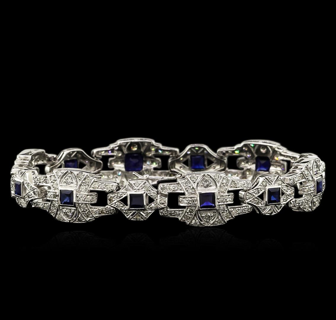 One electronically tested 18KT white gold lady's combination cast & assembled vintage bracelet with a tongue clasp with foldover safety with a bright polish with milgrain detailing finish. Identified with markings of "18K". Condition is new, good workmanship. Containing: One bezel set square emerald standard step cut natural blue sapphire, measuring 5.10 x 5.00 x 3.80mm, approximate weight of 1.00ct., clarity is eye clean, type II, dark, moderately strong, blue color, (GIA B 7/4), cut is very good. Colored gemstones are presumed to have been subjected to commonly used enhancement processes. Graded in the setting. Eleven bezel set square standard step cut natural blue sapphires, measuring 3.60 x 3.50 x 2.20mm, approximate total weight of 2.95ct., clarity is eye clean, type II, medium dark, moderately strong, blue color, (GIA B 6/4), cut is good. Colored gemstones are presumed to have been subjected to commonly used enhancement processes. Graded in the setting. Two Hundred Fifty-Two prong set round brilliant cut diamonds, measuring 1.80 - 1.40 x 0.96mm (depth est.) approximate total weight of 252 Stones = 3.66ct. Graded in the setting. Clarity: VS-2 to SI-2. Color: H - I. Cut Good. Total Weight of Colored Stones 3.95ct. Total Weight of Diamonds 3.66ct. Total Weight of Bracelet 25.00gm. GAS Appraised at $19,030.00.