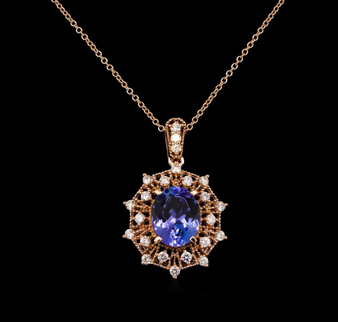 One electronically tested 14KT rose gold lady's combination cast & assembled fashion pendant & chain 18.0" long, 1.2mm round cable link with a lobster claw clasp with a double halo with a bright polish with milgrain detailing finish. Identified with markings of "14K". Condition is new, good workmanship. Containing: One prong set oval modified brilliant cut natural tanzanite, measuring 11.44 x 9.20 x 5.40mm, approximate weight of 3.95ct., clarity is eye clean, type I, medium light, moderately strong, bluish violet color, (GIA bV 4/4), cut is very good. Transmitting light with no distortion, transparent. Colored gemstones are presumed to have been subjected to commonly used enhancement processes. Graded in the setting. Twenty-Three prong set round brilliant cut diamonds, measuring 2.00 - 1.90 x 1.17mm (depth est.) approximate total weight of 23 Stones = 0.62ct. Graded in the setting. Clarity: VS-2 to SI-1. Color: G - Very Good. Total Weight of Colored Stones 3.95ct. Total Weight of Diamonds 0.62ct. Total Weight of Pendant & Chain 6.50gm. GAS Appraised at $8,050.00.