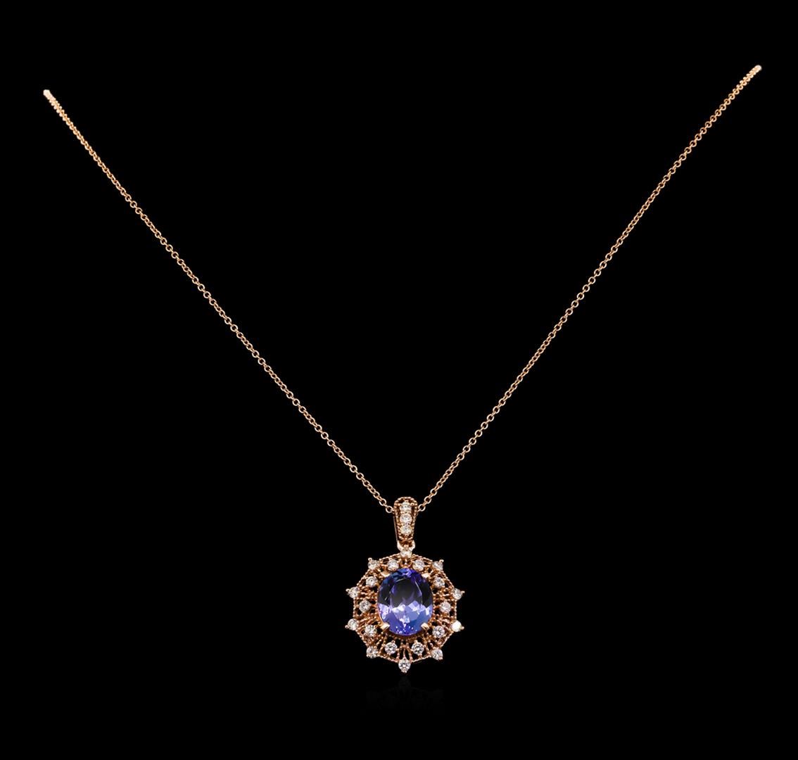 One electronically tested 14KT rose gold lady's combination cast & assembled fashion pendant & chain 18.0" long, 1.2mm round cable link with a lobster claw clasp with a double halo with a bright polish with milgrain detailing finish. Identified with markings of "14K". Condition is new, good workmanship. Containing: One prong set oval modified brilliant cut natural tanzanite, measuring 11.44 x 9.20 x 5.40mm, approximate weight of 3.95ct., clarity is eye clean, type I, medium light, moderately strong, bluish violet color, (GIA bV 4/4), cut is very good. Transmitting light with no distortion, transparent. Colored gemstones are presumed to have been subjected to commonly used enhancement processes. Graded in the setting. Twenty-Three prong set round brilliant cut diamonds, measuring 2.00 - 1.90 x 1.17mm (depth est.) approximate total weight of 23 Stones = 0.62ct. Graded in the setting. Clarity: VS-2 to SI-1. Color: G - Very Good. Total Weight of Colored Stones 3.95ct. Total Weight of Diamonds 0.62ct. Total Weight of Pendant & Chain 6.50gm. GAS Appraised at $8,050.00.