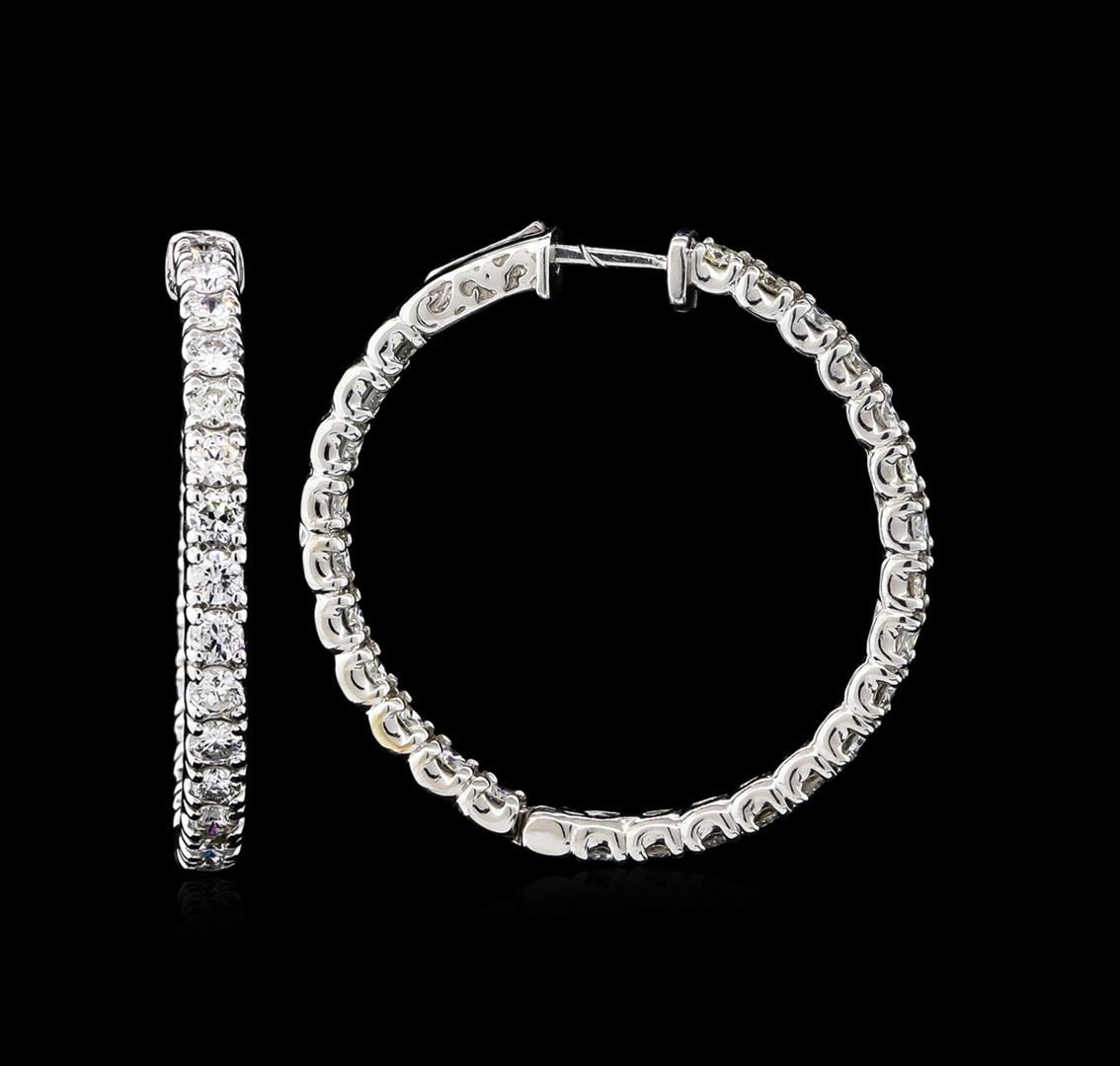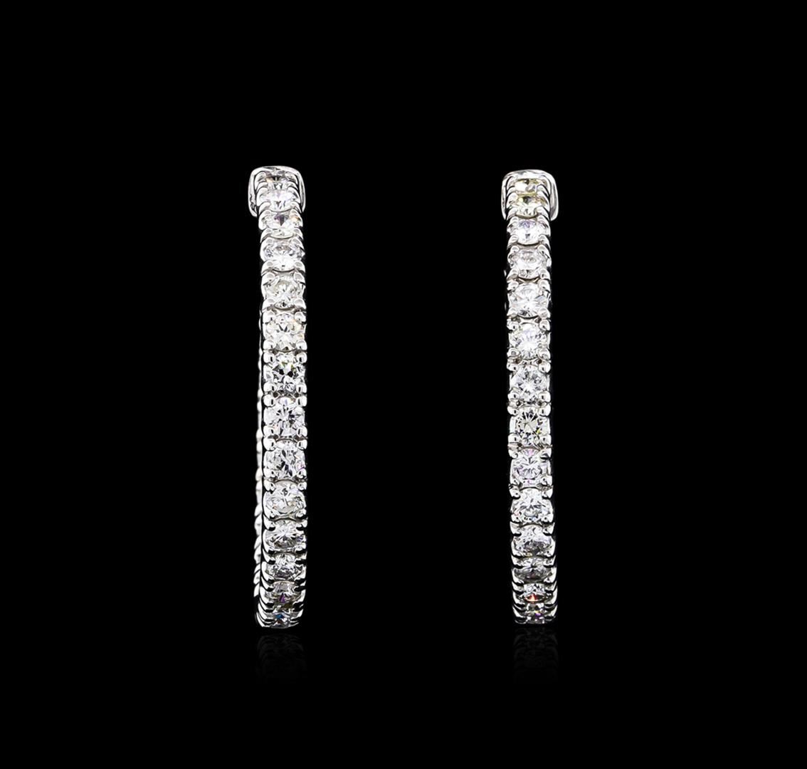 One pair electronically tested 14KT white gold ladies cast & assembled diamond hoop earrings with hinged, snap locking posts. Each earring features a three millimeter wide diamond ribbon set within a thirty four millimeter diameter hoop. Bright polish and engraved finish. Identified with markings of "14K". Condition is good. Containing: Fifty-Two prong set round brilliant cut diamonds, measuring 2.80 - 2.70 x 1.65mm (depth est.) approximate total weight of 52 Stones = 3.96ct. The color grade reflects the entire range of color for this group. Graded in the setting. Clarity: SI-1 to SI-2. Color: F - I. Total Weight of Diamonds 3.96ct. Total Weight of Earrings 12.50gm. AIG Appraised at $14,065.00.
