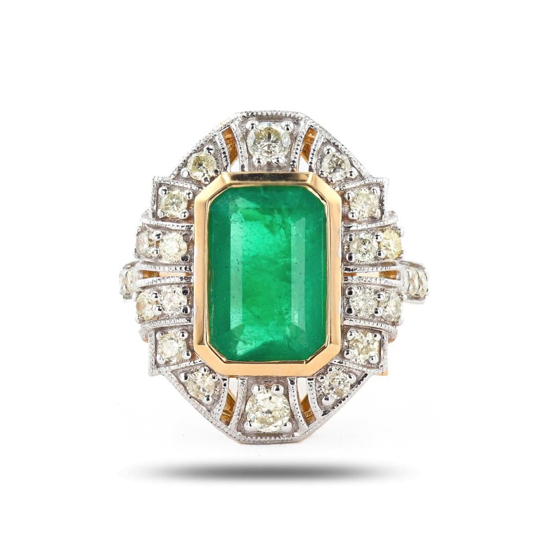 Eighteen karat (18K) two tone gold natural emerald beryl and diamond ring. An octagonal step cut natural emerald beryl gemstone is mounted in the center of the ring. Round brilliant cut diamonds accent the ring around and on both sides of the center gemstone. The ring has a gross weight of 7.5 Grams. Reference: GIA Emerald Report 6224229555 Brand: Oscar Friedman #NATURAL GEMSTONE# GEMSTONE: Emerald Beryl NATURE: Natural SHAPE: Octagonal Step, Faceted Cut WEIGHT: 3.96 carat total DIMENSIONS: 11.41 x 8.03 x 5.67mm CLARITY: Type 3 COLOR: Green (5/5) SYMMETRY: Excellent COLOR INTENSITY: Intense TRANSPARENCY: Transparent TONE: Dark #NATURAL DIAMOND# SHAPE: Round Brilliant Cut WEIGHT: 0.82 carat total (26pcs.) DIMENSIONS: 2.7 x 1.7mm AVERAGE CLARITY: SI1-SI2 AVERAGE COLOR: G-H SYMMETRY: Excellent POLISH: Excellent #METAL# METAL: Gold PURITY: 18K (750) COLOR: Two Tone (Yellow & White) CONDITION: Excellent FINISH: High Polish #LREF-6241