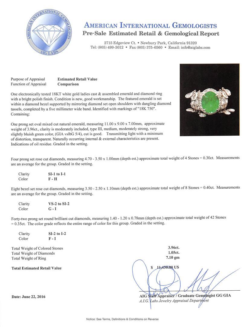 One electronically tested 18KT white gold ladies cast & assembled emerald and diamond ring with a bright polish finish. The featured emerald is set within a diamond bezel supported by mirroring diamond set open shoulders with dangling diamond tassels, completed by a five millimeter wide band. Identified with markings of "18K 750". Condition is new, good workmanship. Containing: One prong set oval mixed cut natural emerald, measuring 11.00. x 9.00. x 7.00.mm, approximate weight of 3.96ct., clarity is moderately included, type III, medium, moderately strong, very slightly bluish green color, (GIA vslbG 5/4), cut is good. Transmitting light with a minimum of distortion, transparent. Naturally occurring internal & external characteristics are present. Indications of oil residue. Graded in the setting. Four prong set rose cut diamonds, measuring 4.70 - 3.50 x 1.00.mm (depth est.) approximate total weight of 4 Stones = 0.30ct. Measurements are an average for the group. Graded in the setting. Clarity: SI-1 to I-1 . Color: F - H Eight bezel set rose cut diamonds, measuring 3.50 - 2.50 x 1.10mm (depth est.) approximate total weight of 8 Stones = 0.40ct. Measurements are an average for the group. Graded in the setting. Clarity: VS-2 to SI-2 . Color: G - I Forty-Two prong set round brilliant cut diamonds, measuring 1.40 - 1.20 x 0.78mm (depth est.) approximate total weight of 42 Stones = 0.35ct. The color grade reflects the entire range of color for this group. Graded in the setting. Clarity: SI-2 to I-2 . Color: F - I. Total Weight of Colored Stones 3.96ct.. Total Weight of Diamonds 1.05ct.. Total Weight of Ring 7.10gm. AIG Appraised at $11,430.00.