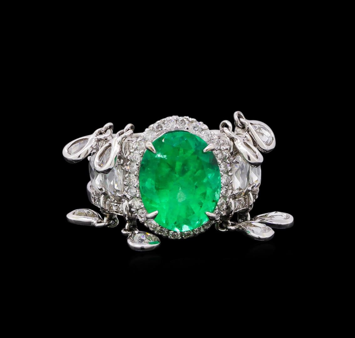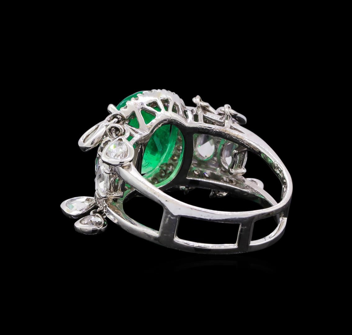One electronically tested 18KT white gold ladies cast & assembled emerald and diamond ring with a bright polish finish. The featured emerald is set within a diamond bezel supported by mirroring diamond set open shoulders with dangling diamond tassels, completed by a five millimeter wide band. Identified with markings of "18K 750". Condition is new, good workmanship. Containing: One prong set oval mixed cut natural emerald, measuring 11.00. x 9.00. x 7.00.mm, approximate weight of 3.96ct., clarity is moderately included, type III, medium, moderately strong, very slightly bluish green color, (GIA vslbG 5/4), cut is good. Transmitting light with a minimum of distortion, transparent. Naturally occurring internal & external characteristics are present. Indications of oil residue. Graded in the setting. Four prong set rose cut diamonds, measuring 4.70 - 3.50 x 1.00.mm (depth est.) approximate total weight of 4 Stones = 0.30ct. Measurements are an average for the group. Graded in the setting. Clarity: SI-1 to I-1 . Color: F - H Eight bezel set rose cut diamonds, measuring 3.50 - 2.50 x 1.10mm (depth est.) approximate total weight of 8 Stones = 0.40ct. Measurements are an average for the group. Graded in the setting. Clarity: VS-2 to SI-2 . Color: G - I Forty-Two prong set round brilliant cut diamonds, measuring 1.40 - 1.20 x 0.78mm (depth est.) approximate total weight of 42 Stones = 0.35ct. The color grade reflects the entire range of color for this group. Graded in the setting. Clarity: SI-2 to I-2 . Color: F - I. Total Weight of Colored Stones 3.96ct.. Total Weight of Diamonds 1.05ct.. Total Weight of Ring 7.10gm. AIG Appraised at $11,430.00.