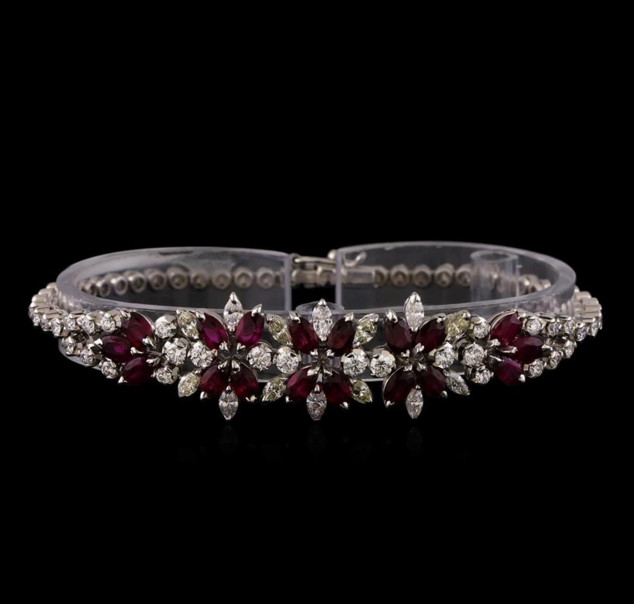 One electronically tested 18KT white gold ladies cast & assembled ruby and diamond bracelet. Seven inch length bracelet features a series of ruby and diamond florets transitioning into flexible diamond ribbons, terminating in a concealed clasp with safety. Bright polish finish. Trademark is G.C.I. Identified with markings of '18Kt'. Condition is good. Containing: Eighteen prong set marquise mixed cut natural rubies, measuring 5.00 x 3.00 x 1.95mm, approximate total weight of 3.96ct., clarity is slightly included, type II, medium dark, very slightly brownish, slightly purplish red color, (GIA slpR 6/3), cut is good. Transmitting light with a minimum of distortion, transparent. Naturally occurring internal & external characteristics are present. Measurements & the color grade are an average for the group. Graded in the setting. Fourteen prong set marquise shaped cut diamonds, measuring 4.00 x 2.50 x 1.58mm (depth est.) approximate total weight of 14 Stones = 1.28ct. The color grade reflects the entire range of color for this group. Graded in the setting. Clarity SI-1 to I-2. Color: G - L Eight prong set round brilliant cut diamonds, measuring 2.80 - 2.70 x 1.65mm (depth est.) approximate total weight of 8 Stones = 0.62ct. Graded in the setting. Clarity I-1 to I-2. Color: G - I Fifty-Two prong set round brilliant cut diamonds, measuring 2.10 - 2.00 x 1.23mm (depth est.) approximate total weight of 52 Stones = 1.73ct. Graded in the setting. Clarity SI-2 to I-1. Color: G - I. Total Weight of Colored Stones 3.96ct.. Total Weight of Diamonds 3.63ct.. Total Weight of Bracelet 19.32gm. AIG Appraised.