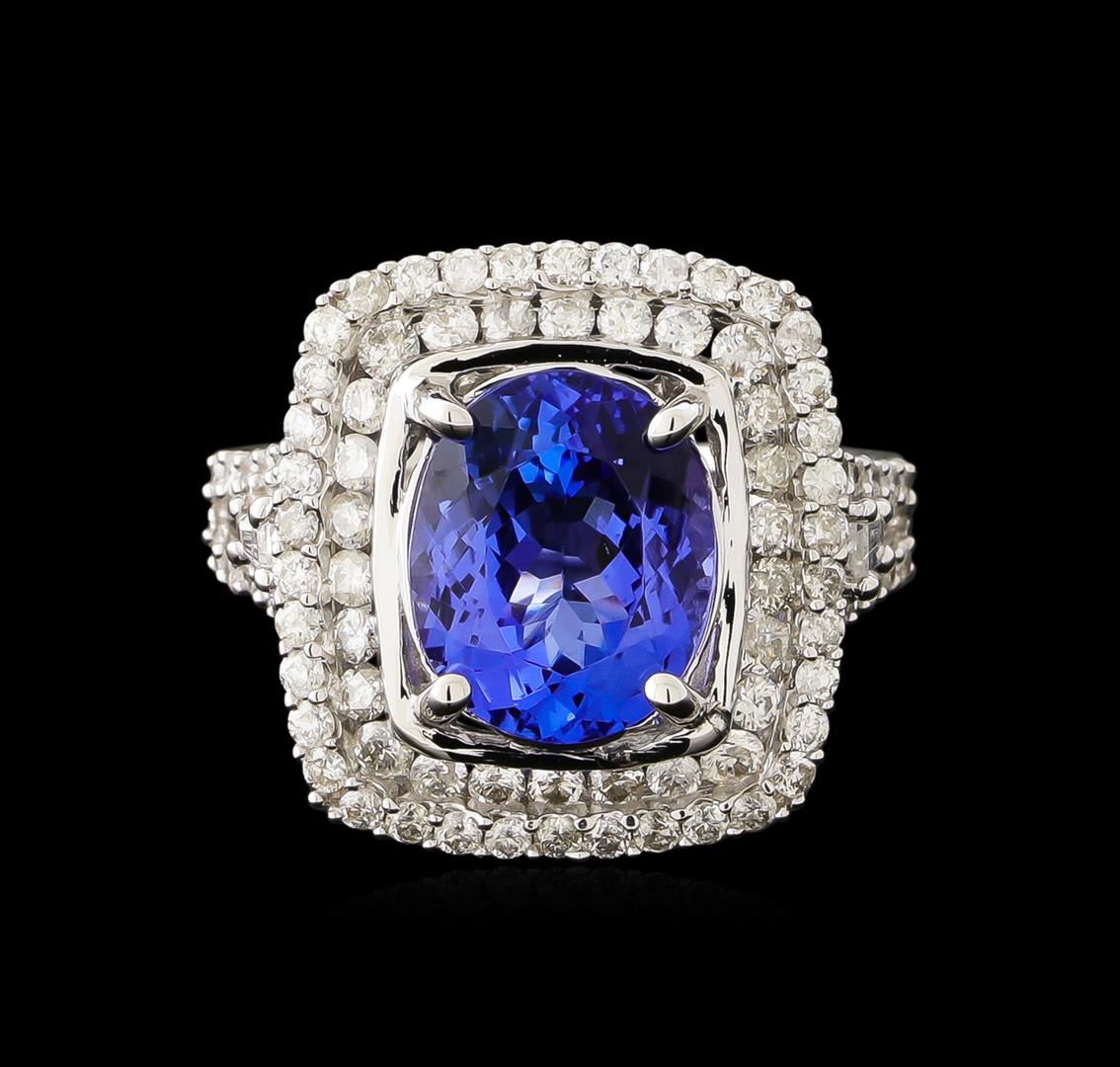 One electronically tested 14KT white gold ladies cast tanzanite and diamond ring with a bright polish finish. The featured tanzanite is set within tiered diamond bezels supported by diamond set split shoulders, completed by a two and one-half millimeter wide band. Trademark is Orianne. Identified with markings of "14K". Condition is new, good workmanship. Containing: One prong set oval mixed cut natural tanzanite, measuring 10.90 x 8.85 x 5.50mm, 6%. bulge factor, approximate weight of 3.96ct., clarity is eye clean, type I, medium dark, very slightly grayish, bluish violet color, (GIA bV 6/3), cut is good. Transmitting light with no distortion, transparent. Graded in the setting. Tanzanite is a very rare gemstone that is only found in the country of Tanzania. Originally discovered in 1967. Tiffany & Company, named the stone Tanzanite. It is found in the Usumburu Mountains that border the Umba Valley of northern Tanzania. Tanzanite occurs in gray, brown, violet, blue, reddish-purple, & green. The gem is interesting because of its exceptional pleochroism. Rotated in different directions a tanzanite will exhibit multiple changes of color. Tanzanite has a low tolerance to ultrasonic cleaning, and should not be cleaned using this method. Eighty-Eight prong & channel set round brilliant cut diamonds, measuring 1.70 - 1.30 x 0.90mm (depth est.) approximate total weight of 88 Stones = 1.21ct. Graded in the setting. Clarity: I-2 to I-3. Color: G - I Two prong set baguette cut (tapered) diamonds, measuring from 3.80 x 1.60 x 1.12mm (depth est.) to 4.20 x 1.80 x 1.26mm (depth est.) approximate total weight of 2 Stones = 0.15ct. Graded in the setting. Clarity: SI-2 to I-1. Color: H. Total Weight of Colored Stones 3.96ct. Total Weight of Diamonds 1.36ct. Total Weight of Ring 6.44gm. AIG Appraised at $12,350.00.