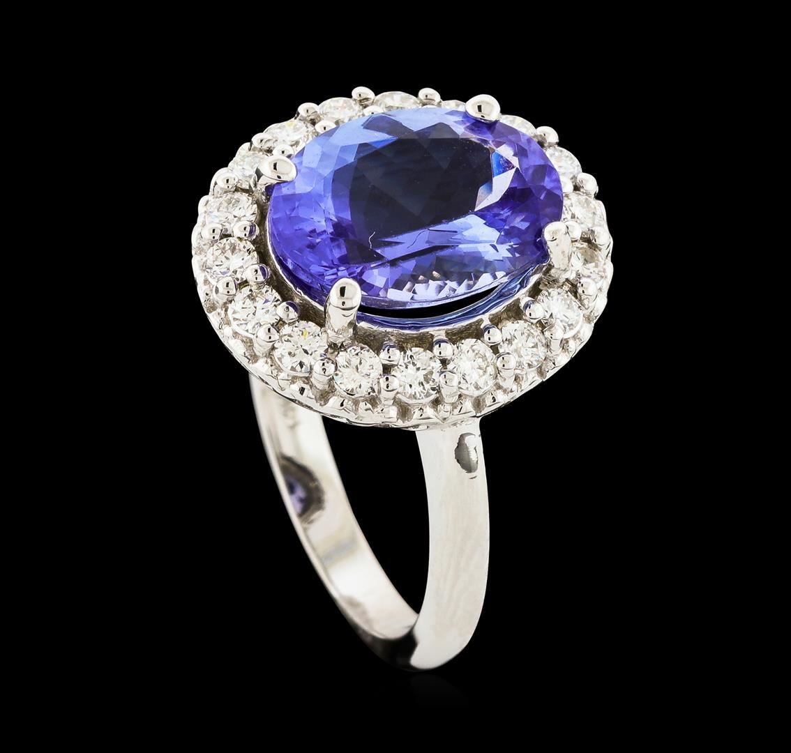 One electronically tested 14KT white gold lady's cast fashion ring with a basket halo with a bright polish finish. The featured lady's ring has a shank measuring 2.47 millimeters wide. Identified with markings of '14K'. Condition is new, good workmanship. Containing: One prong set oval modified brilliant cut natural tanzanite, measuring 11.88 x 8.90 x 5.47mm, (depth est.) approximate weight of 3.96ct., clarity is eye clean, medium, very slightly grayish, violet color, (GIA V 5/3), cut is good. Transmitting light with no distortion, transparent. Colored gemstones are presumed to have been subjected to commonly used enhancement processes. Graded in the setting. Eighteen prong set round brilliant cut diamonds, measuring 2.10 - 2.00 x 1.25mm (depth est.) approximate total weight of 18 Stones = 0.58ct. Graded in the setting. Clarity SI-1 to SI-2. Color: H - I Cut Good. Total Weight of Colored Stones 3.96ct.. Total Weight of Diamonds 0.58ct.. Total Weight of Ring 6.70gm. GAS Appraised at $6,865.00.