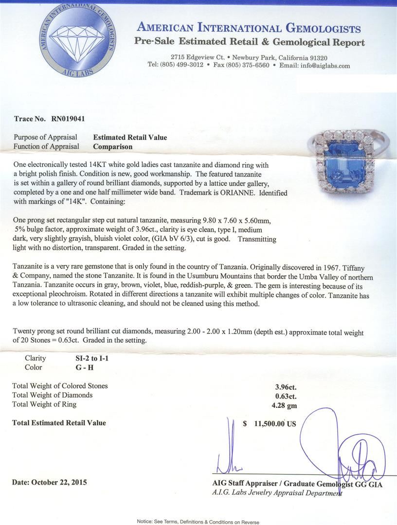 One electronically tested 14KT white gold ladies cast tanzanite and diamond ring with a bright polish finish. The featured tanzanite is set within a gallery of round brilliant diamonds, supported by a lattice under gallery, completed by a one and one half millimeter wide band. Trademark is ORIANNE. Identified with markings of "14K". Condition is new, good workmanship. Containing: One prong set rectangular step cut natural tanzanite, measuring 9.80 x 7.60 x 5.60mm, 5%. bulge factor, approximate weight of 3.96ct., clarity is eye clean, type I, medium dark, very slightly grayish, bluish violet color, (GIA bV 6/3), cut is good. Transmitting light with no distortion, transparent. Graded in the setting. Tanzanite is a very rare gemstone that is only found in the country of Tanzania. Originally discovered in 1967. Tiffany & Company, named the stone Tanzanite. It is found in the Usumburu Mountains that border the Umba Valley of northern Tanzania. Tanzanite occurs in gray, brown, violet, blue, reddish-purple, & green. The gem is interesting because of its exceptional pleochroism. Rotated in different directions a tanzanite will exhibit multiple changes of color. Tanzanite has a low tolerance to ultrasonic cleaning, and should not be cleaned using this method. Twenty prong set round brilliant cut diamonds, measuring 2.00 - 2.00 x 1.20mm (depth est.) approximate total weight of 20 Stones = 0.63ct. Graded in the setting. Clarity: SI-2 to I-1. Color: G - H. Total Weight of Colored Stones 3.96ct. Total Weight of Diamonds 0.63ct. Total Weight of Ring 4.28gm. AIG Appraised at $11,500.00.