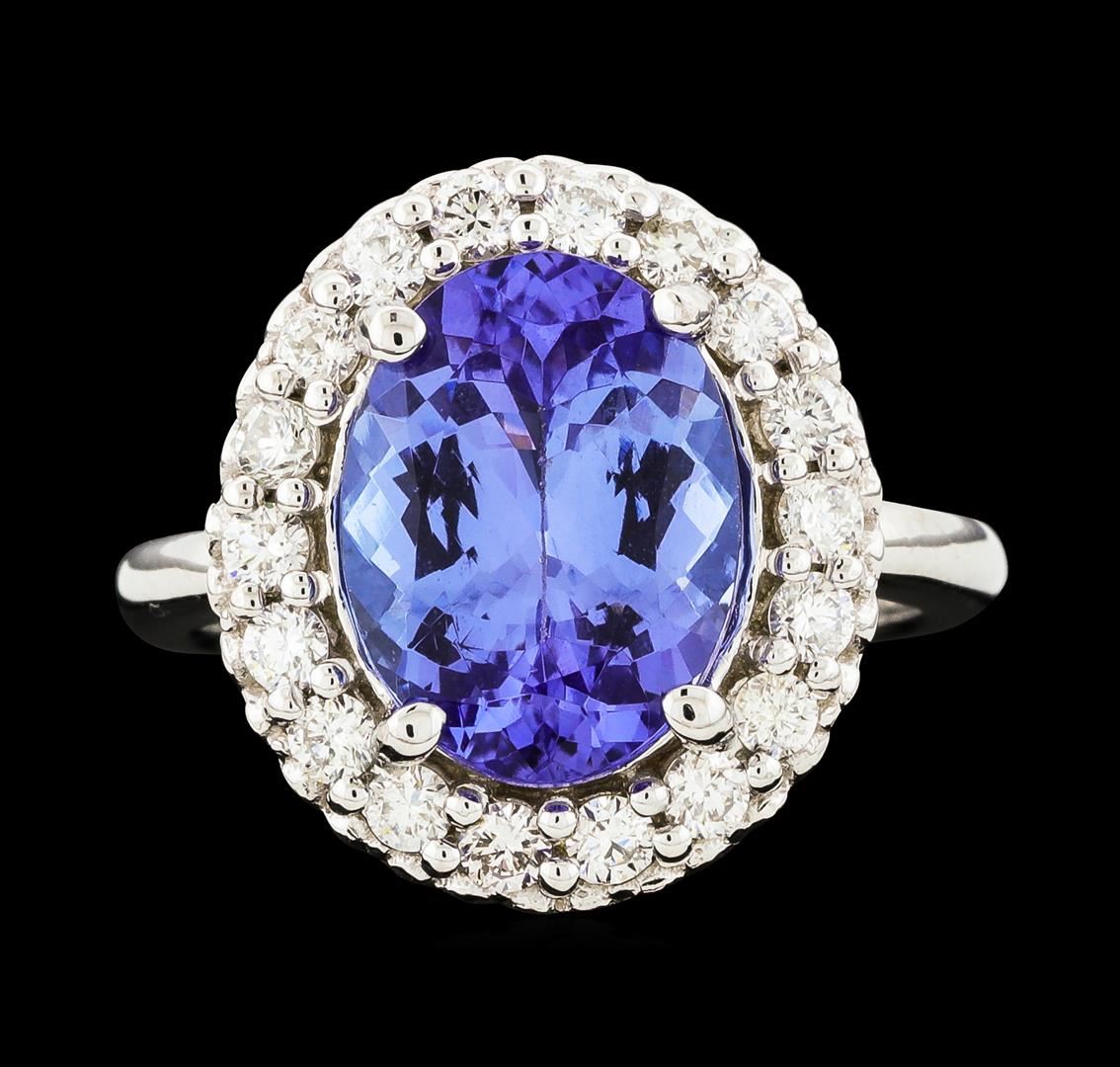 One electronically tested 14KT white gold lady's cast fashion ring with a basket halo with a bright polish finish. The featured lady's ring has a shank measuring 2.47 millimeters wide. Identified with markings of '14K'. Condition is new, good workmanship. Containing: One prong set oval modified brilliant cut natural tanzanite, measuring 11.88 x 8.90 x 5.47mm, (depth est.) approximate weight of 3.96ct., clarity is eye clean, medium, very slightly grayish, violet color, (GIA V 5/3), cut is good. Transmitting light with no distortion, transparent. Colored gemstones are presumed to have been subjected to commonly used enhancement processes. Graded in the setting. Eighteen prong set round brilliant cut diamonds, measuring 2.10 - 2.00 x 1.25mm (depth est.) approximate total weight of 18 Stones = 0.58ct. Graded in the setting. Clarity SI-1 to SI-2. Color: H - I Cut Good. Total Weight of Colored Stones 3.96ct.. Total Weight of Diamonds 0.58ct.. Total Weight of Ring 6.70gm. GAS Appraised at $6,865.00.