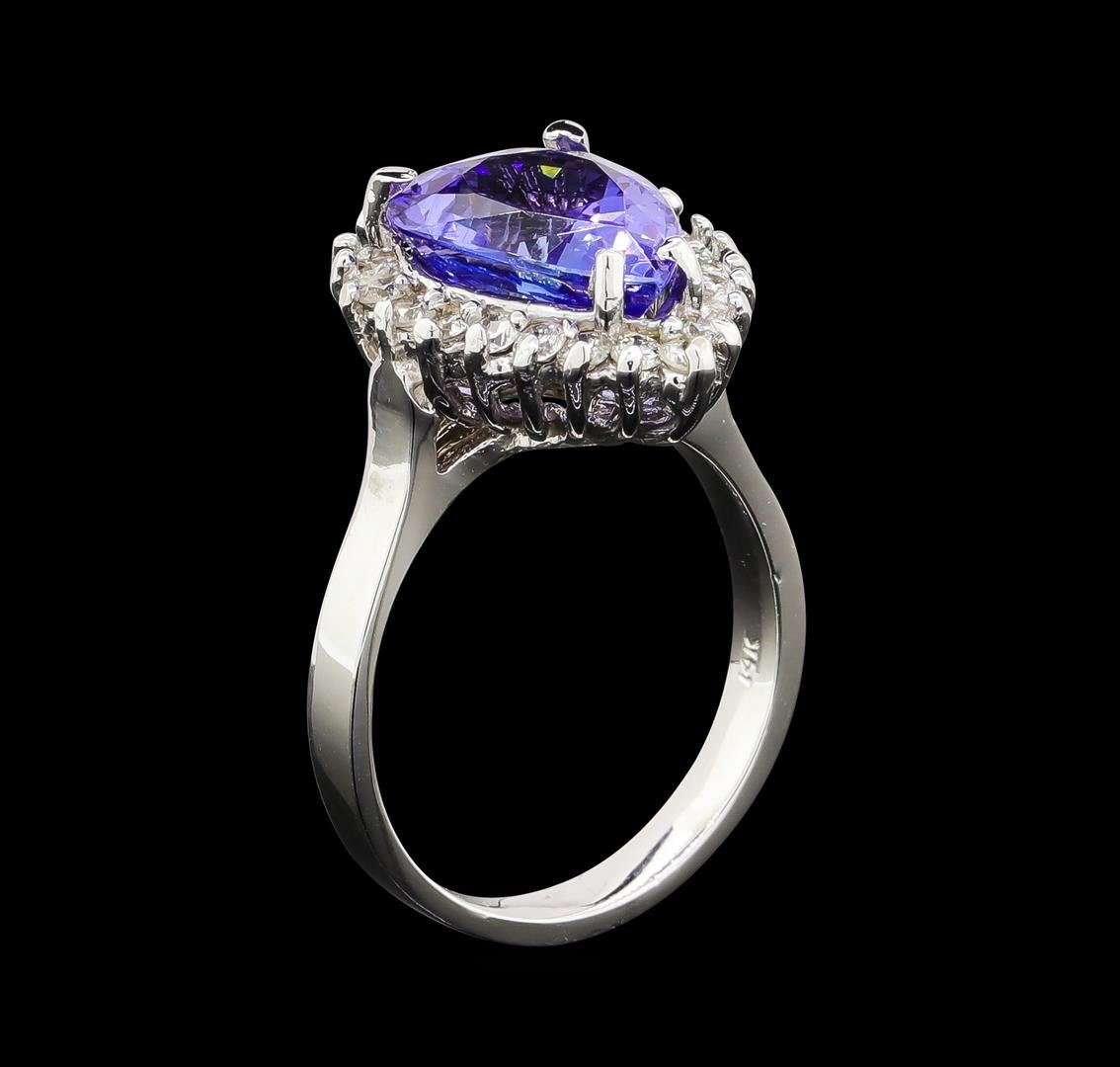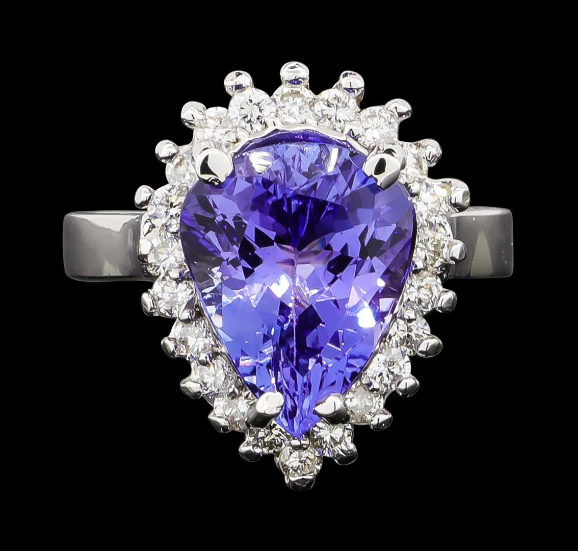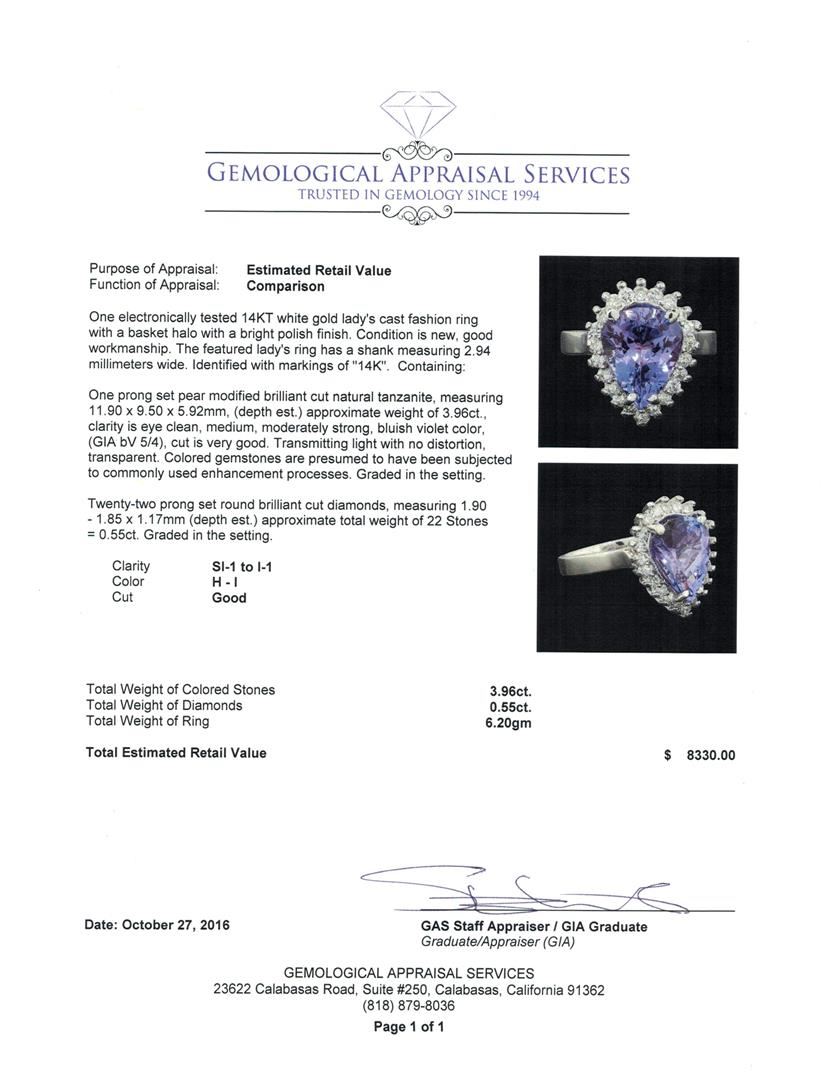 One electronically tested 14KT white gold lady's cast fashion ring with a basket halo with a bright polish finish. The featured lady's ring has a shank measuring 2.94 millimeters wide. Identified with markings of '14K'. Condition is new, good workmanship. Containing: One prong set pear modified brilliant cut natural tanzanite, measuring 11.90 x 9.50 x 5.92mm, (depth est.) approximate weight of 3.96ct., clarity is eye clean, medium, moderately strong, bluish violet color, (GIA bV 5/4), cut is very good. Transmitting light with no distortion, transparent. Colored gemstones are presumed to have been subjected to commonly used enhancement processes. Graded in the setting. Twenty-Two prong set round brilliant cut diamonds, measuring 1.90 - 1.85 x 1.17mm (depth est.) approximate total weight of 22 Stones = 0.55ct. Graded in the setting. Clarity SI-1 to I-1. Color: H - I Cut Good. Total Weight of Colored Stones 3.96ct.. Total Weight of Diamonds 0.55ct.. Total Weight of Ring 6.20gm. GAS Appraised at $8,330.00.