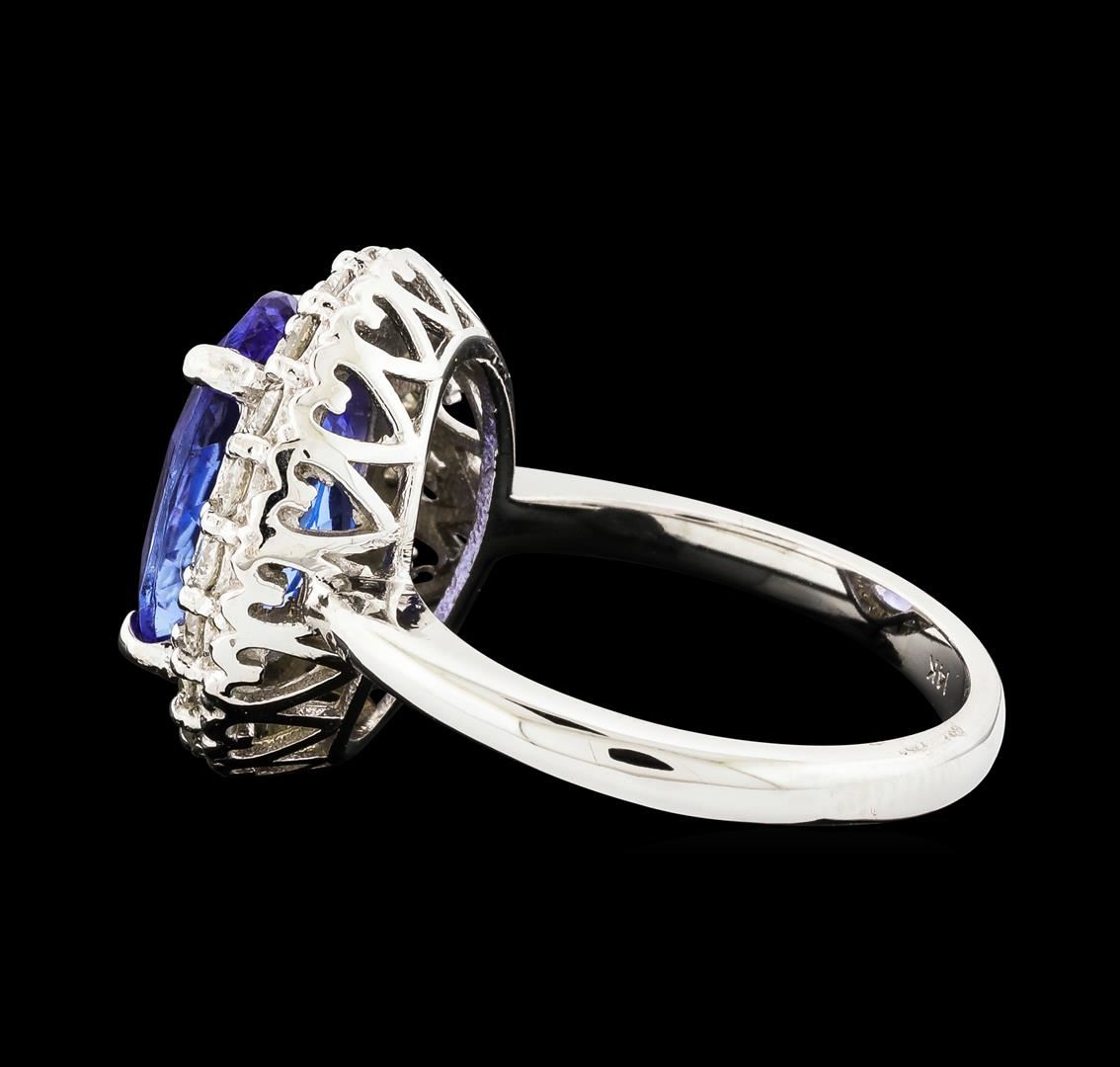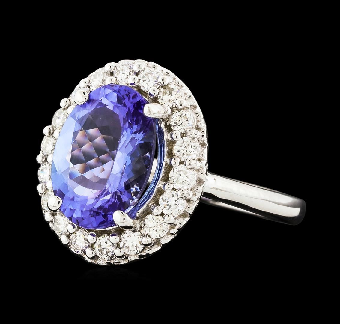 One electronically tested 14KT white gold lady's cast fashion ring with a basket halo with a bright polish finish. The featured lady's ring has a shank measuring 2.47 millimeters wide. Identified with markings of '14K'. Condition is new, good workmanship. Containing: One prong set oval modified brilliant cut natural tanzanite, measuring 11.88 x 8.90 x 5.47mm, (depth est.) approximate weight of 3.96ct., clarity is eye clean, medium, very slightly grayish, violet color, (GIA V 5/3), cut is good. Transmitting light with no distortion, transparent. Colored gemstones are presumed to have been subjected to commonly used enhancement processes. Graded in the setting. Eighteen prong set round brilliant cut diamonds, measuring 2.10 - 2.00 x 1.25mm (depth est.) approximate total weight of 18 Stones = 0.58ct. Graded in the setting. Clarity SI-1 to SI-2. Color: H - I Cut Good. Total Weight of Colored Stones 3.96ct.. Total Weight of Diamonds 0.58ct.. Total Weight of Ring 6.70gm. GAS Appraised at $6,865.00.