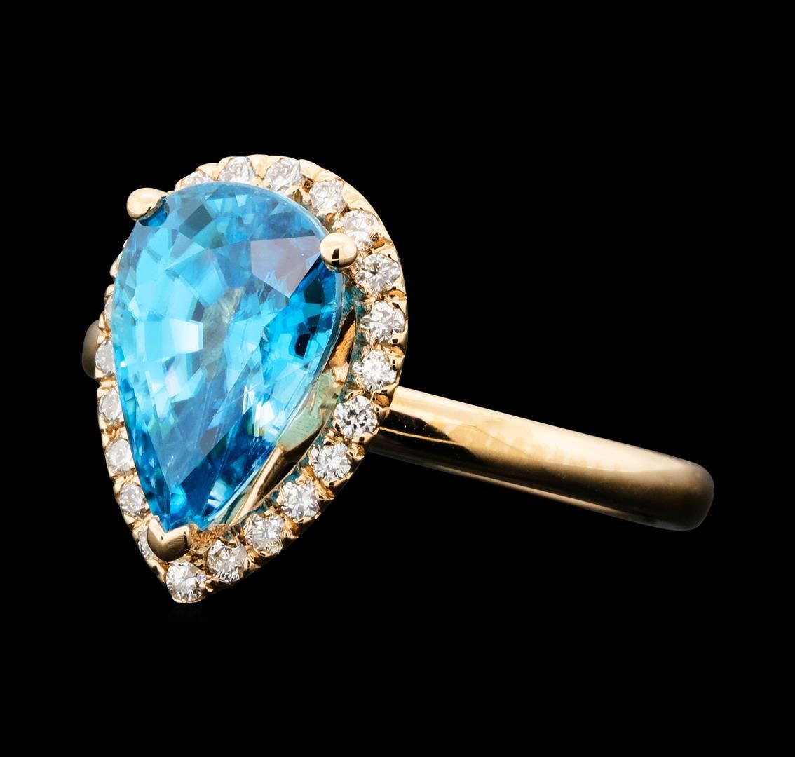 One blue topaz and diamond ring featuring: 14KT rose gold weighing 3.78 grams, one center blue topaz weighing 3.98 ct and diamonds weighing 0.21ctw.