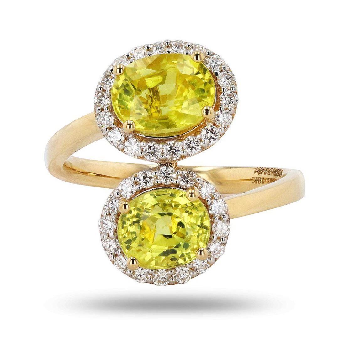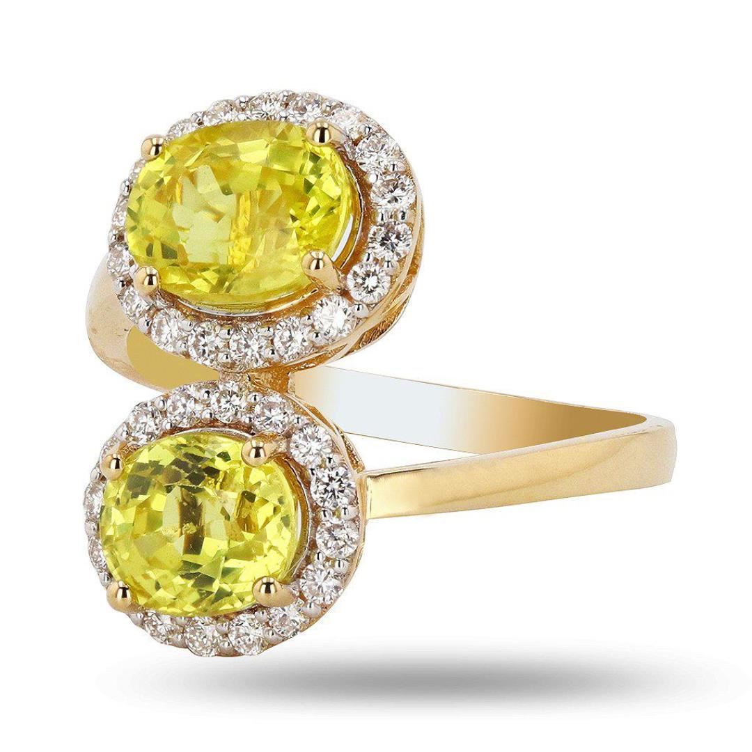 One electronically tested 18KT yellow gold cast yellow sapphire & diamond ring. Each of the featured sapphires are set within a diamond bezel, supported by a ribbed under gallery, completed by a two millimeter wide band. Bright polish finish. Trademark is Orianne. Identified with markings of "18K". Condition is new, good workmanship Containing: Two prong set cushion & oval shape mixed cut natural yellow sapphires approximate total weight of 3.99ctw., clarity is slightly included, medium, very slightly brownish, greenish yellow color, (GIA gY 5/3), cut is good. Transmitting light with a minimum of distortion, transparent. Naturally occurring internal & external characteristics are present. Graded in the setting. Thirty-four prong set round brilliant cut diamonds approximate total weight of 34 Stones = 0.40ctw. Graded in the setting. Clarity VS2 to SI2 Color F - H Total Weight of Colored Stones 3.99ctw. Total Weight of Diamonds 0.40ctw. Total Weight of Ring 5.20 gm #LREF-4386