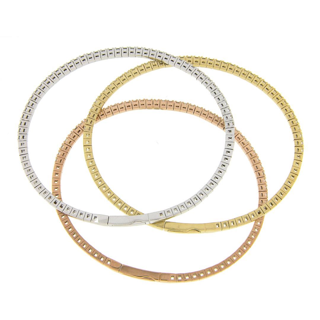 A new set of 3 14k yellow, white & rose gold stack bangle bracelets, with 126 round cut natural diamonds (F/G - VVS2-VS2 ; 4.08ctw). It weighs a total of 25.21 grams, measures 2.1mm wide each, and measures 6.5 inches in length.