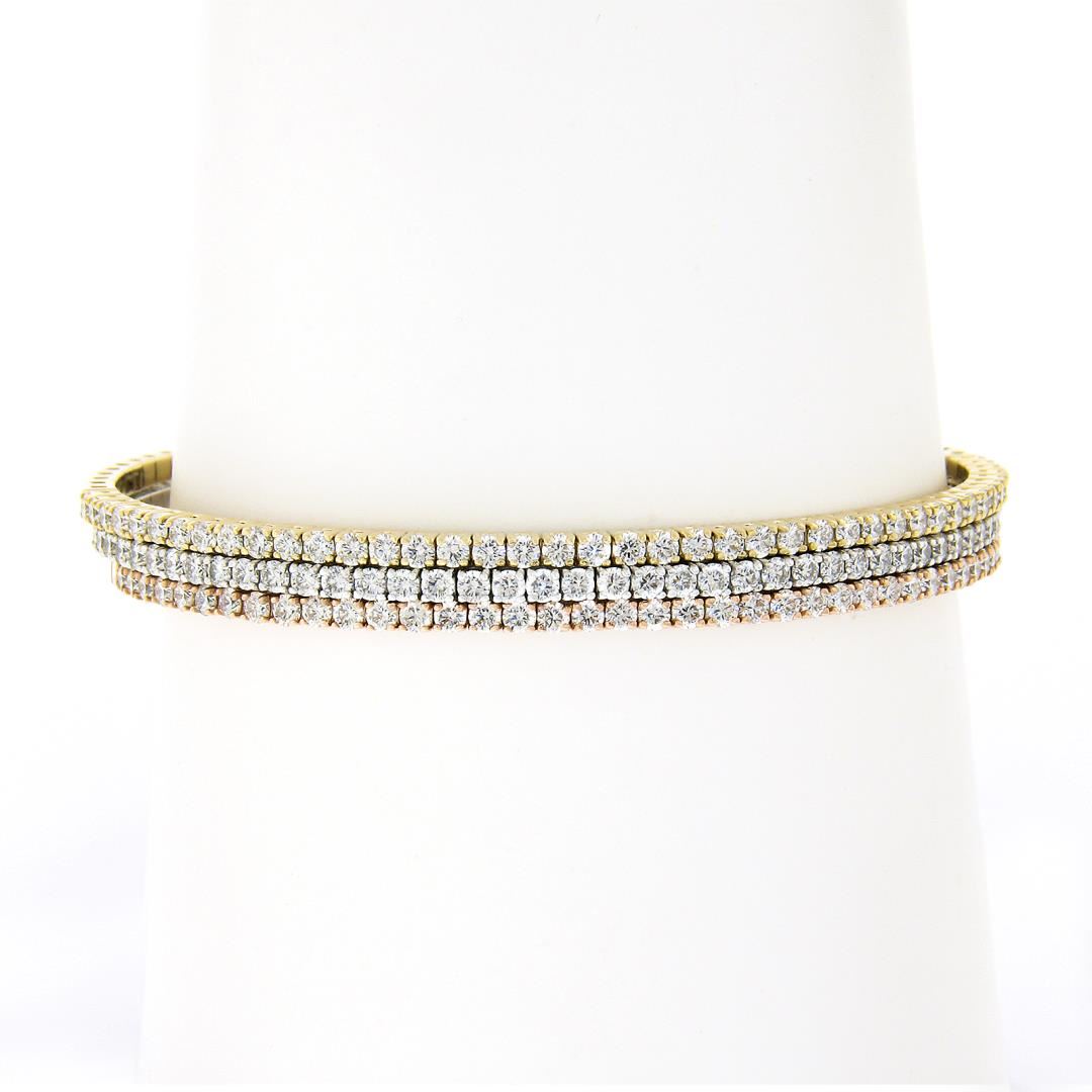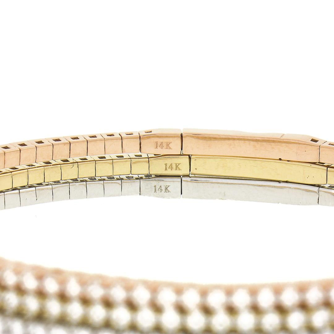 A new set of 3 14k yellow, white & rose gold stack bangle bracelets, with 126 round cut natural diamonds (F/G - VVS2-VS2 ; 4.08ctw). It weighs a total of 25.21 grams, measures 2.1mm wide each, and measures 6.5 inches in length.