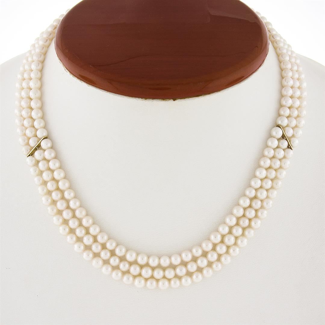 A solid 14k yellow gold strand necklace, with round shape numerous cultures pearls (4-4.5mm). 14.5 inch 3 strand bead link chain, 29.32 grams total weight, clasp measures 18.25x8.30mm.