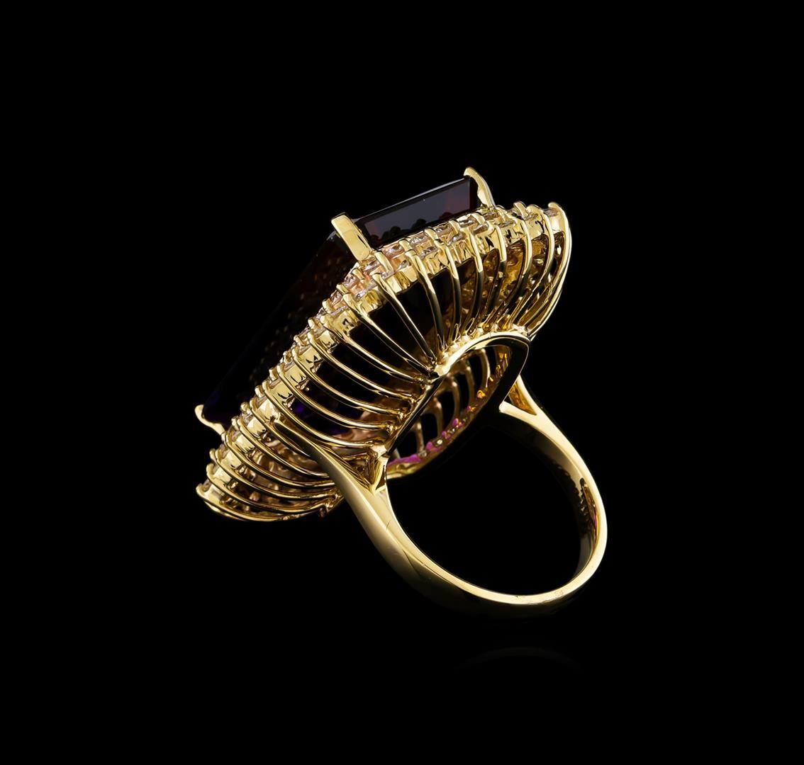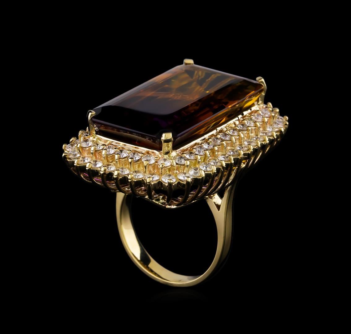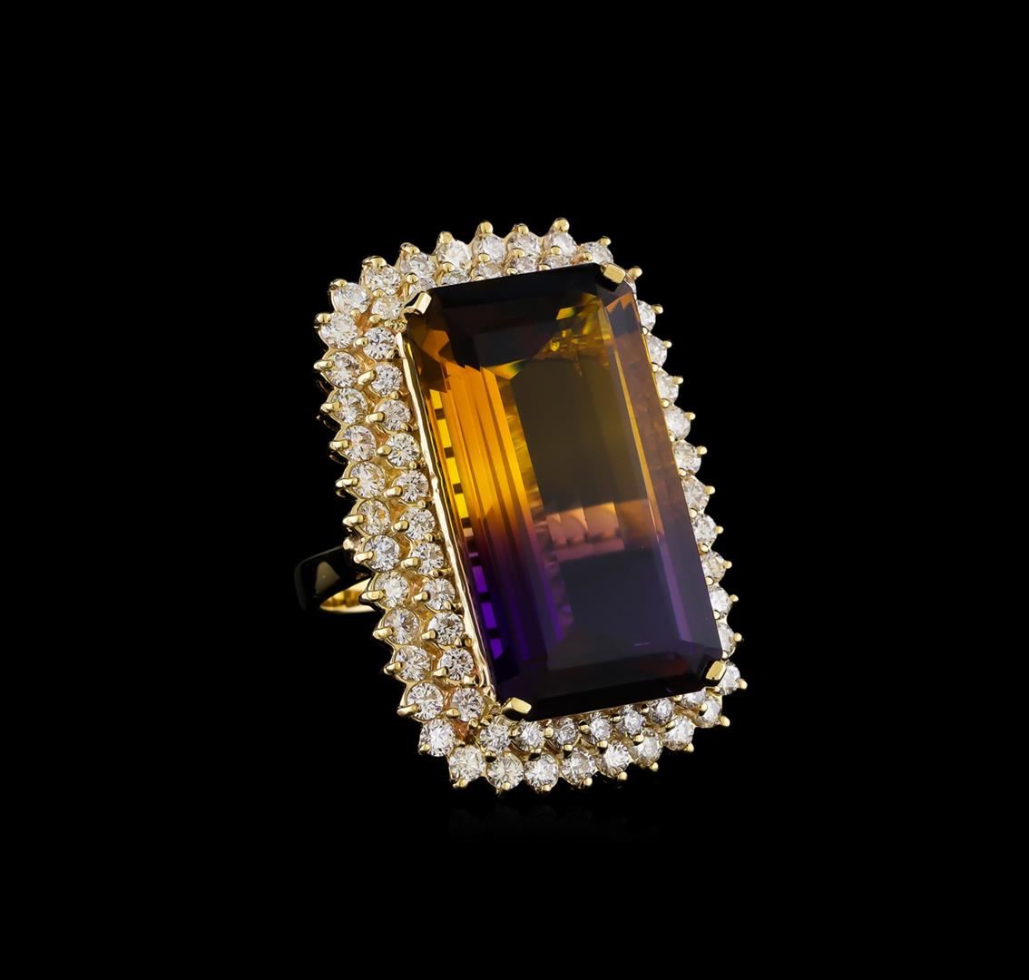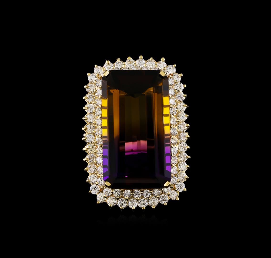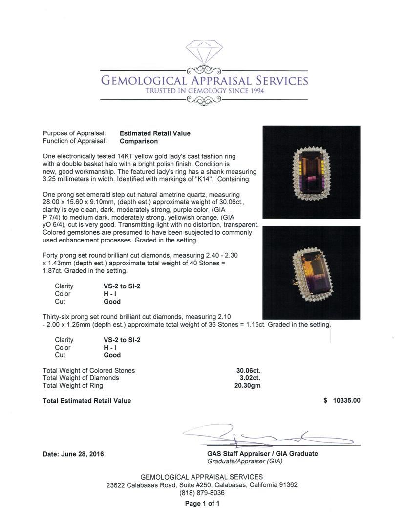 One electronically tested 14KT yellow gold lady's cast fashion ring with a double basket halo with a bright polish finish. The featured lady's ring has a shank measuring 3.25 millimeters in width. Identified with markings of "K14". Condition is new, good workmanship. Containing: One prong set emerald step cut natural ametrine quartz, measuring 28.00 x 15.60 x 9.10mm, (depth est.) approximate weight of 30.06ct., clarity is eye clean, dark, moderately strong, purple color, (GIA P 7/4) to medium dark, moderately strong, yellowish orange, (GIA yO 6/4), cut is very good. Transmitting light with no distortion, transparent. Colored gemstones are presumed to have been subjected to commonly used enhancement processes. Graded in the setting. Forty prong set round brilliant cut diamonds, measuring 2.40 - 2.30 x 1.43mm (depth est.) approximate total weight of 40 Stones = 1.87ct. Graded in the setting. Clarity: VS-2 to SI-2. Color: H - I. Cut Good Thirty-Six prong set round brilliant cut diamonds, measuring 2.10 - 2.00 x 1.25mm (depth est.) approximate total weight of 36 Stones = 1.15ct. Graded in the setting. Clarity: VS-2 to SI-2. Color: H - I. Cut Good. Total Weight of Colored Stones 30.06ct. Total Weight of Diamonds 3.02ct. Total Weight of Ring 20.30gm. GAS Appraised at $10,335.00.