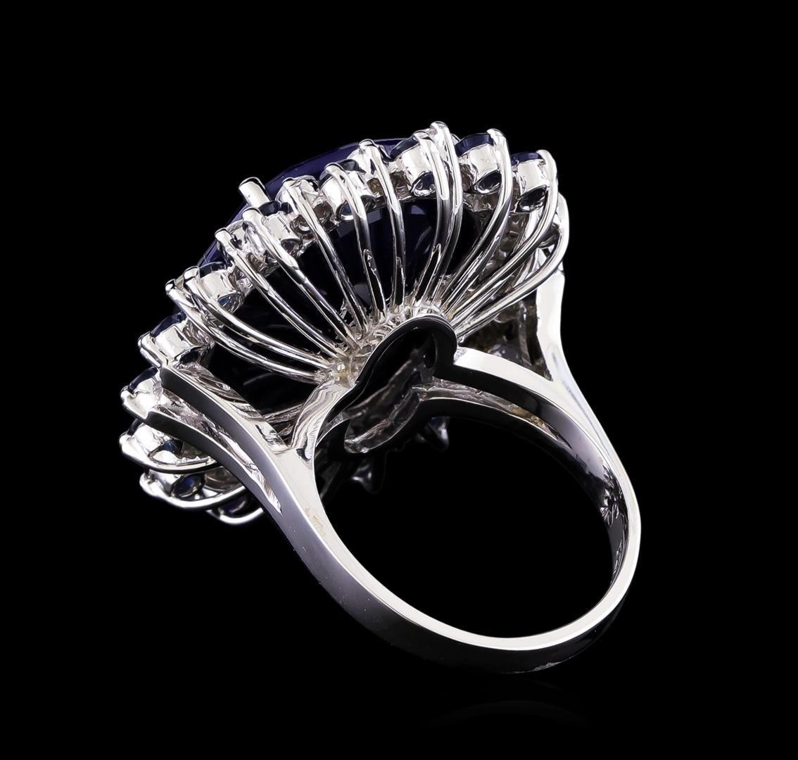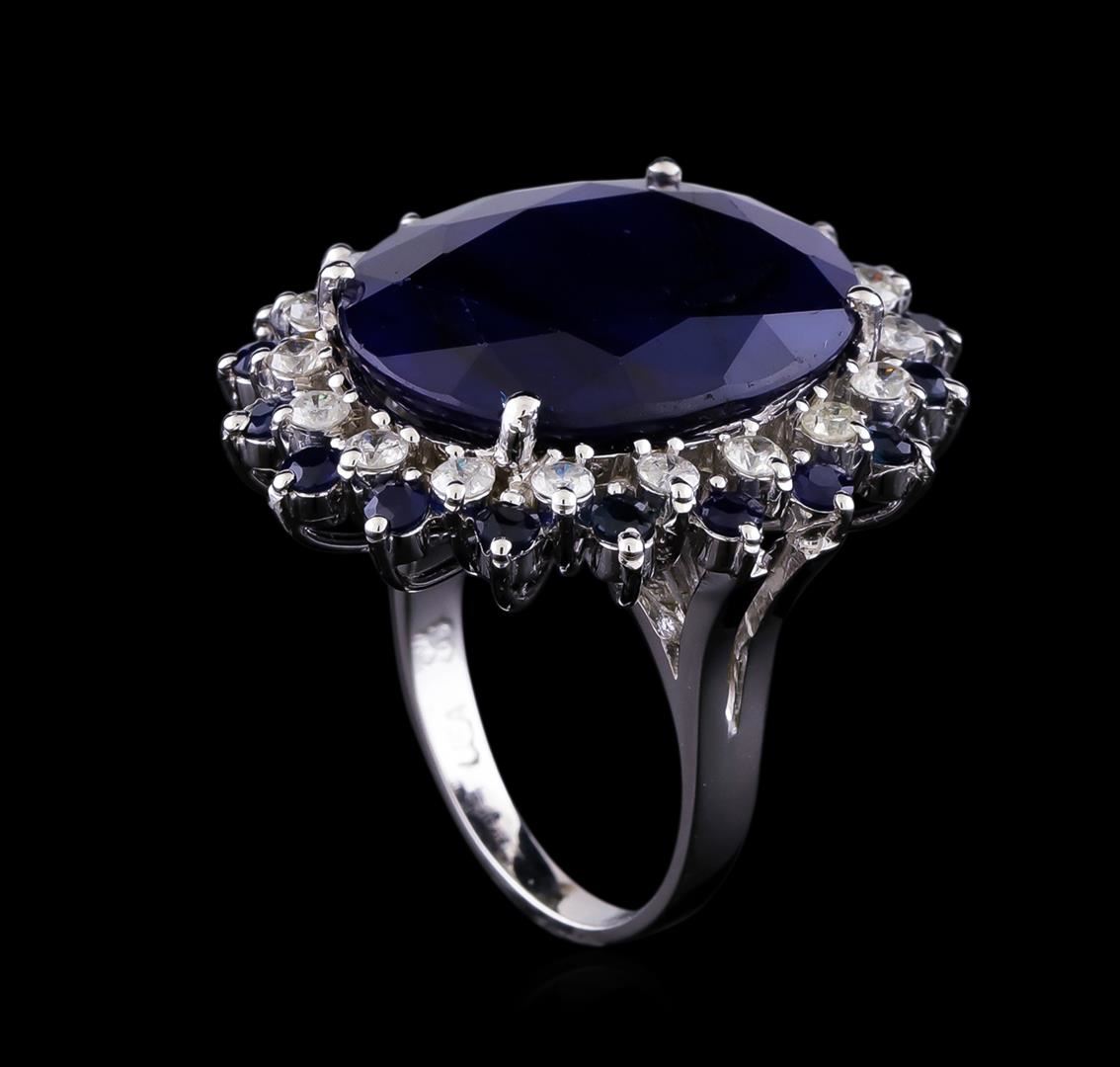 14K Gold Sapphire & Diamond Ring. One polished, stamped, and tested 14K white gold ring mounted with: 19 faceted sapphires weighing approximately 30.22 carats, and 18 faceted round diamonds weighing approximately 1.06 carats. This item weighs 17.0 grams, condition is new, very good workmanship. Main Gemstones: Species: Natural Corundum. Variety: Sapphire. Shape: Oval/Round. Quantity: 19 Sapphires. Measurements: 21.1 x 17.4 mm (1 oval). 2.7 mm (18 round). Total weight: 30.22 carats. Color: Dark blue. Cut grade: Very good. Treatment: Fracture filled. Refractive index: 1.762-1.770 DR. Birefringence: 0.008-0.010. Hardness: 9. Adjacent Gemstones on Ring: Identity: Natural Diamond. Shape: Round. Cutting style: Brilliant cut. Quantity: 18 Diamonds. Measurements: 2.7 mm. Total weight: 1.06 carats. Clarity grade: SI2-I1. Color grade: I-J. Refractive Index: 2.418. Hardness: 10. Gold content: 14K White Gold. AIGL Appraised at $13,464.00.