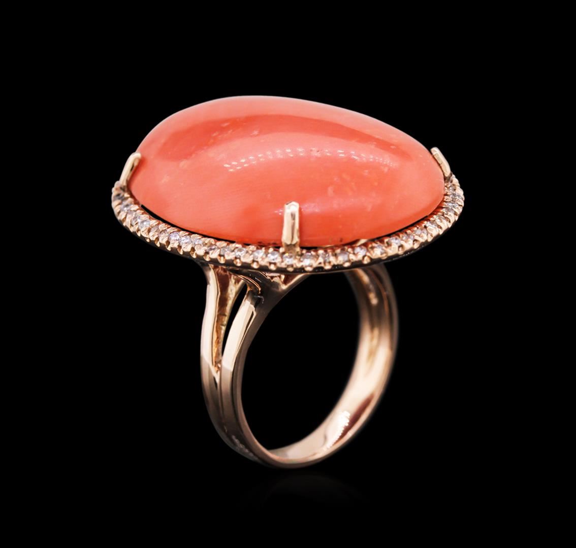 One electronically tested 14KT rose gold ladies cast coral and diamond ring with a bright polish finish. Identified with markings of "14K". Condition is new. Containing: One prong set oval cabochon cut natural pink coral, measuring 29.84 x 21.91 x 6.50mm, approximate weight of 30.29ct., clarity is severely included, light, very slightly grayish, pink color, (GIA Pk 3/3), cut is good. Sixty-Two prong set round brilliant cut diamonds, measuring 1.10 - 1.10 x 0.66mm (depth est.) approximate. Total Weight of 62 Stones = 0.45ct. Clarity: I-1 to I-2. Color: I - J, Cut is Good. Colored gemstones are presumed to have been subjected to commonly used enhancement processes. All diamonds and colored gemstones are graded in the mounting, unless otherwise stated. Total Weight of Colored Stones 30.29ct. Total Weight of Diamonds 0.45ct. Total Weight of Ring 13.90 grams. GGL Appraised at $4,330.00.