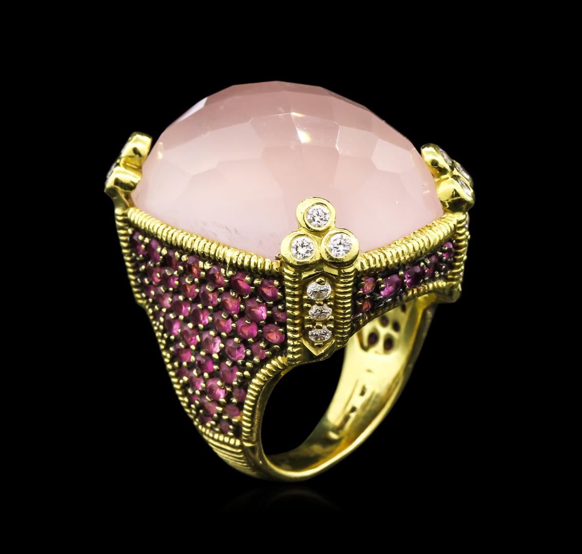 One electronically tested 18KT yellow gold ladies cast multi gemstone and diamond ring. Condition is good. The ring is from Judith Ripka's Monaco Collection. The ring features a rose quartz set within diamond accented prongs supported by a pink sapphire and diamond under gallery and pink sapphire set shoulders, completed by a patterned four and one-half millimeter wide band. Bright and anodized finish. Trademark is JR. Identified with markings of "18K". Containing: One prong set rectangular cushion cabochon mixed cut natural rose quartz, measuring 25.00 x 20.00 x 8.50mm, approximate weight of 30.62ct., clarity is heavily included, medium dark, very slightly grayish, pink color, (GIA Pk 6/3), cut is good. Transmitting light somewhat diffusely, translucent. Naturally occurring internal & external characteristics are present. Graded in the setting. Ninety-four prong set round mixed cut natural pink sapphires, measuring 2.10 - 1.90 x 1.30 mm, approximate total weight of 4.70ct., clarity is eye clean, type II, medium, very slightly brownish, slightly purplish red color, (GIA slpR 5/3), cut is good. Transmitting light with no distortion, transparent. Color grade is an average for the group. Graded in the setting. Twenty-four prong and bezel set round brilliant cut diamonds, measuring 2.00 - 1.80 x 1.14mm (depth est.) approximate total weight of 24 Stones = 0.70ct. Graded in the setting. Clarity: VVS-2 to VS-1. Color: F - H. Total Weight of Colored Stones: 35.32ct. Total Weight of Diamonds: 0.70ct. Total Weight of Ring: 33.18 gm. AIG Appraised at $10,200.00.