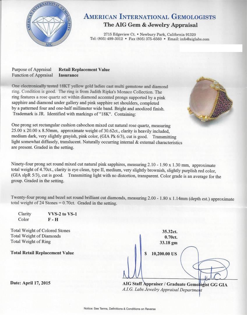 One electronically tested 18KT yellow gold ladies cast multi gemstone and diamond ring. Condition is good. The ring is from Judith Ripka's Monaco Collection. The ring features a rose quartz set within diamond accented prongs supported by a pink sapphire and diamond under gallery and pink sapphire set shoulders, completed by a patterned four and one-half millimeter wide band. Bright and anodized finish. Trademark is JR. Identified with markings of "18K". Containing: One prong set rectangular cushion cabochon mixed cut natural rose quartz, measuring 25.00 x 20.00 x 8.50mm, approximate weight of 30.62ct., clarity is heavily included, medium dark, very slightly grayish, pink color, (GIA Pk 6/3), cut is good. Transmitting light somewhat diffusely, translucent. Naturally occurring internal & external characteristics are present. Graded in the setting. Ninety-four prong set round mixed cut natural pink sapphires, measuring 2.10 - 1.90 x 1.30 mm, approximate total weight of 4.70ct., clarity is eye clean, type II, medium, very slightly brownish, slightly purplish red color, (GIA slpR 5/3), cut is good. Transmitting light with no distortion, transparent. Color grade is an average for the group. Graded in the setting. Twenty-four prong and bezel set round brilliant cut diamonds, measuring 2.00 - 1.80 x 1.14mm (depth est.) approximate total weight of 24 Stones = 0.70ct. Graded in the setting. Clarity: VVS-2 to VS-1. Color: F - H. Total Weight of Colored Stones: 35.32ct. Total Weight of Diamonds: 0.70ct. Total Weight of Ring: 33.18 gm. AIG Appraised at $10,200.00.