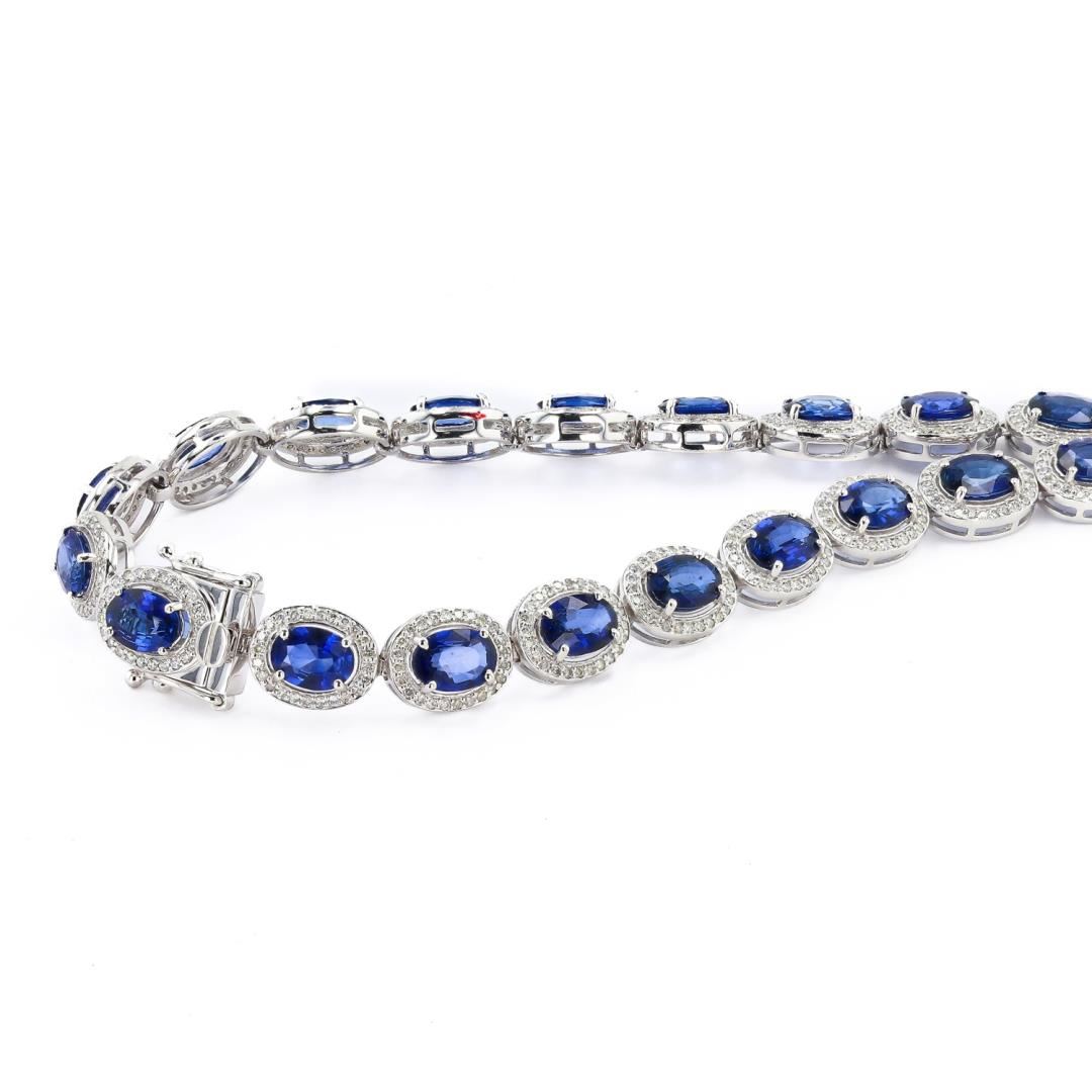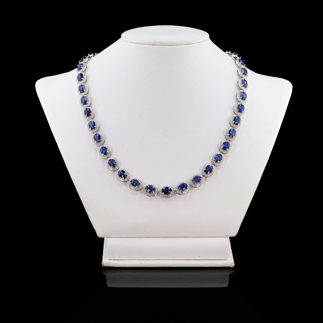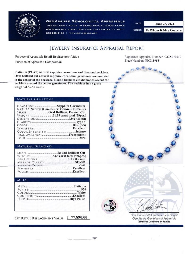 Platinum (PLAT) natural sapphire corundum and diamond necklace. Oval brilliant cut natural sapphire corundum gemstones are mounted in the center of the necklace. Round brilliant cut diamonds accent the necklace around he center gemstones. The necklace has a gross weight of 56.8 Grams. #NATURAL GEMSTONE# GEMSTONE: Sapphire Corundum NATURE: Natural (Comments: Titanium Diffused) SHAPE: Oval Brilliant, Faceted Cut WEIGHT: 31.58 carat total (39pcs.) DIMENSIONS: 7.0 x 4.8mm CLARITY: Type 3 COLOR: Blue (5/5) SYMMETRY: Excellent COLOR INTENSITY: Intense TRANSPARENCY: Transparent TONE: Dark #NATURAL DIAMOND# SHAPE: Round Brilliant Cut WEIGHT: 3.66 carat total (936pcs.) DIMENSIONS: 1.1 x 0.9mm AVERAGE CLARITY: SI1-SI2 AVERAGE COLOR: G-H SYMMETRY: Excellent POLISH: Excellent #METAL# METAL: Platinum PURITY: 950 COLOR: White CONDITION: Excellent FINISH: High POLISH #LREF-21741