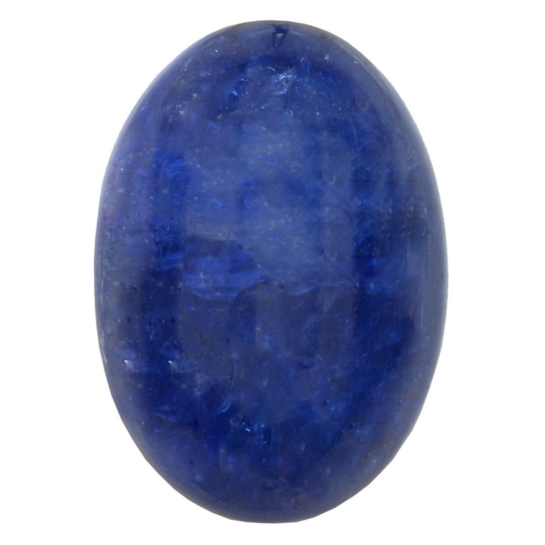 One oval cabochon cut natural tanzanite, measuring 22.00 x 16.00 x 9.50mm, exact weight 31.58ct., clarity is heavily included, type I, dark, moderately strong, blue color, (GIA B 7/4), cut is good. Transmitting light somewhat diffusely, transparent to translucent. Naturally occurring internal & external characteristics are present. Indications of heat treatment.
