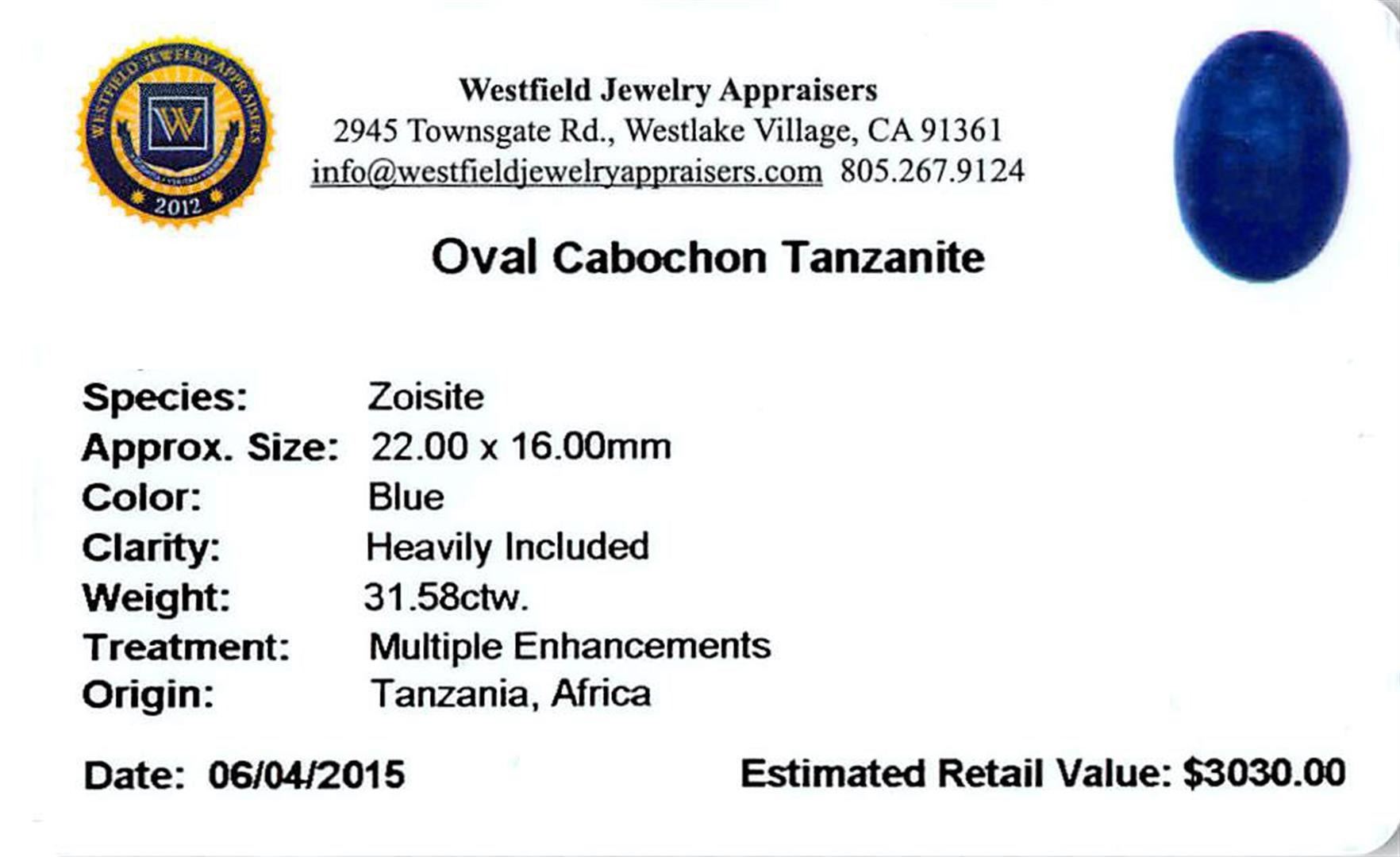One oval cabochon cut natural tanzanite, measuring 22.00 x 16.00 x 9.50mm, exact weight 31.58ct., clarity is heavily included, type I, dark, moderately strong, blue color, (GIA B 7/4), cut is good. Transmitting light somewhat diffusely, transparent to translucent. Naturally occurring internal & external characteristics are present. Indications of heat treatment.