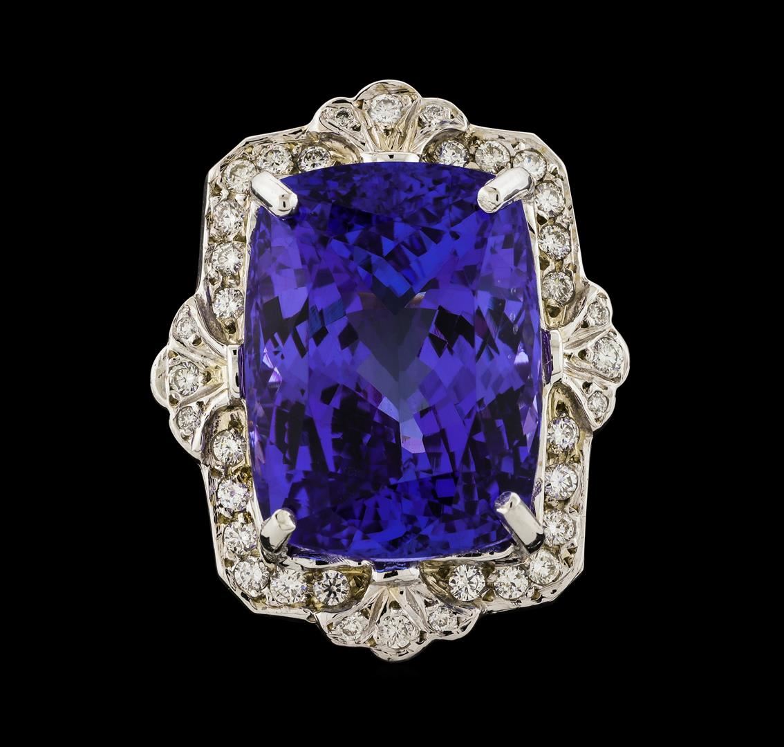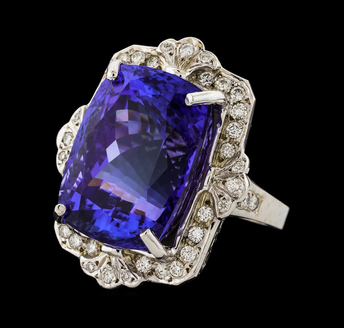 One electronically tested 14KT white gold lady's cast fashion ring with a scalloped cathedral halo with a bright polish finish. The featured lady's ring has a shank measuring 2.45 millimeters wide. Identified with markings of 'K14'. Condition is new, good workmanship. Containing: One prong set rectangular cushion modified brilliant cut natural tanzanite, measuring 19.50 x 14.40 x 12.89mm, (depth est.) 11%. bulge factor, approximate weight of 31.60ct., clarity is eye clean, medium, moderately strong, violetish blue color, (GIA vB 5/4), cut is very good. Transmitting light with no distortion, transparent. Colored gemstones are presumed to have been subjected to commonly used enhancement processes. Graded in the setting. Thirty-Four prong set round brilliant cut diamonds, measuring 1.80 - 1.70 x 1.09mm (depth est.) approximate total weight of 34 Stones = 0.71ct. Graded in the setting. Clarity SI-1 to SI-2. Color: G - H Cut Good Eight prong set round brilliant cut diamonds, measuring 1.20 - 1.15 x 0.73mm (depth est.) approximate total weight of 8 Stones = 0.05ct. Graded in the setting. Clarity SI-1 to SI-2. Color: G - H Cut Good. Total Weight of Colored Stones 31.60ct.. Total Weight of Diamonds 0.76ct.. Total Weight of Ring 17.90gm. GAS Appraised at $38,095.00.