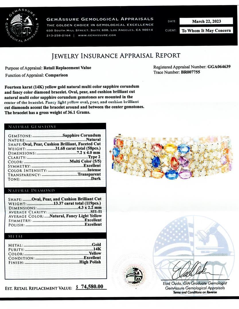 31.68ctw Multi-Color Sapphire and 13.37ctw Diamond 14K Yellow Gold Bracelet. Fourteen karat (14K) yellow gold natural multi color sapphire corundum and fancy color diamond bracelet. Oval, pear, and cushion brilliant cut natural multi color sapphire corundum gemstones are mounted in the center of the bracelet. Fancy light yellow ova!, pear, and cushion brilliant cut diamonds accent the bracelet around and between the center gemstones. The bracelet has a gross weight of 36.1 Grams. NATURAL GEMSTONE GEMSTONE: Sapphire Corundum NATURE: Natural SHAPE: Oval, Pear, Cushion Brilliant, Faceted Cut WEIGHT: 31.68 carat total (58pcs.) DIMENSIONS: 7.2 x 4.0mm CLARITY: Type 2 COLOR: Multi Color (5/5) SYMMETRY: Excellent COLOR INTENSITY: Intense TRANSPARENCY: Transparent TONE: Dark NATURAL DIAMOND SHAPE: Oval, Pear, and Cushion Brilliant Cut WEIGHT: 13.37 carat total (119pcs.) DIMENSIONS: 4.3 x 2.2mm AVERAGE CLARITY: SI1-I1 AVERAGE COLOR: Natural, Fancy Light Yellow SYMMETRY: Excellent POLISH: Excellent METAL METAL: Gold PURITY: 14K COLOR: Yellow CONDITION: Excellent FINISH: High Polish