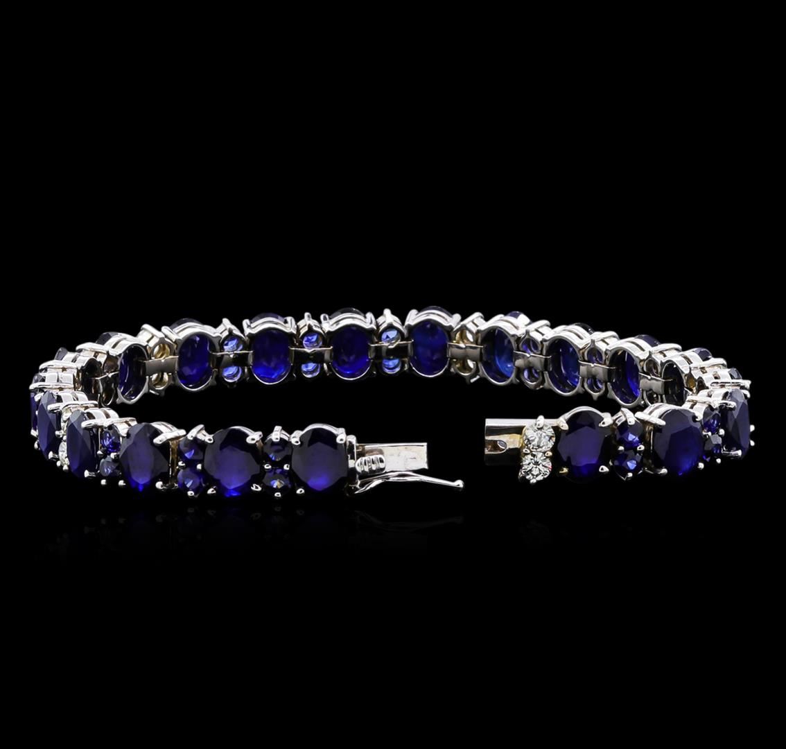 One ladies Jaqu Lili bracelet with genuine natural color sapphires and diamonds well made in solid white gold. Total item width 8mm, height 5mm. Condition is new, good workmanship. Stamped 14k and logo. Containing: Fifty multi-shaped sapphires weighing approximately 31.89ctw. Color: Blue (color diffused). Clarity: Clean. The bracelet also contains ten round shaped diamonds weighing approximately 1.31ctw. Color: J-K. Clarity: SI2-SI3. Total Weight of Gemstones: 33.20ctw. Total Item Weight: 25.8 grams. IGL Appraised.
