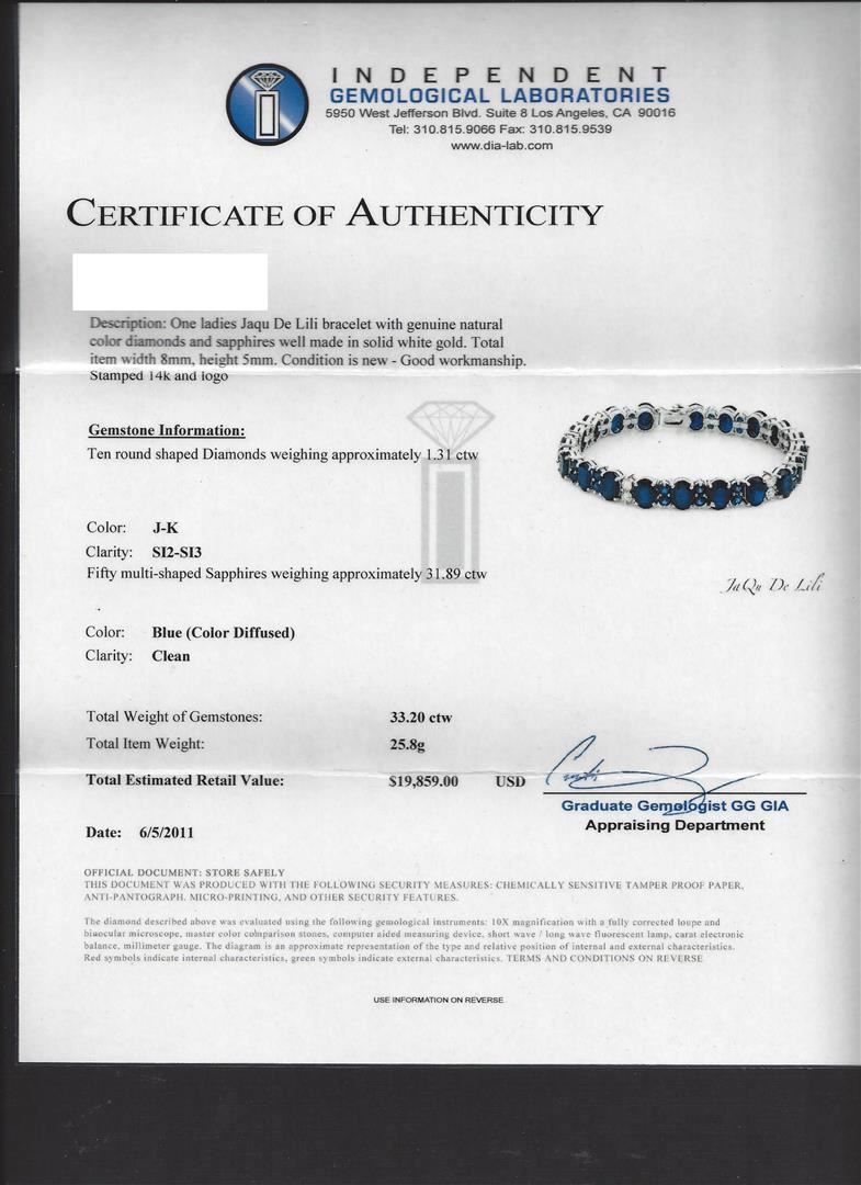 One ladies Jaqu Lili bracelet with genuine natural color sapphires and diamonds well made in solid white gold. Total item width 8mm, height 5mm. Condition is new, good workmanship. Stamped 14k and logo. Containing: Fifty multi-shaped sapphires weighing approximately 31.89ctw. Color: Blue (color diffused). Clarity: Clean. The bracelet also contains ten round shaped diamonds weighing approximately 1.31ctw. Color: J-K. Clarity: SI2-SI3. Total Weight of Gemstones: 33.20ctw. Total Item Weight: 25.8 grams. IGL Appraised.