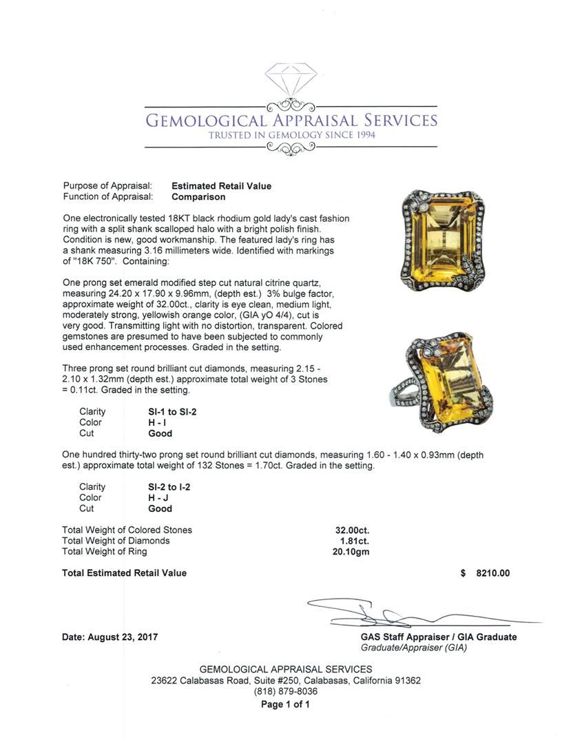 One electronically tested 18KT black rhodium gold lady's cast fashion ring with a split shank scalloped halo with a bright polish finish. The featured lady's ring has a shank measuring 3.16 millimeters wide. Identified with markings of '18K 750'. Condition is new, good workmanship. Containing: One prong set emerald modified step cut natural citrine quartz, measuring 24.20 x 17.90 x 9.96mm, (depth est.) 3%. bulge factor, approximate weight of 32.00ct., clarity is eye clean, medium light, moderately strong, yellowish orange color, (GIA yO 4/4), cut is very good. Transmitting light with no distortion, transparent. Colored gemstones are presumed to have been subjected to commonly used enhancement processes. Graded in the setting. Three prong set round brilliant cut diamonds, measuring 2.15 - 2.10 x 1.32mm (depth est.) approximate total weight of 3 Stones = 0.11ct. Graded in the setting. Color H - I Clarity SI-1 to SI-2 Cut Good One Hundred Thirty-Two prong set round brilliant cut diamonds, measuring 1.60 - 1.40 x 0.93mm (depth est.) approximate total weight of 132 Stones = 1.70ct. Graded in the setting. Color H - J Clarity SI-2 to I-2 Cut Good. Total Weight of Colored Stones 32.00ct.. Total Weight of Diamonds 1.81ct.. Total Weight of Ring 20.10gm GAS Appraised at $8210.00. GAS Appraised at $8,210.00.