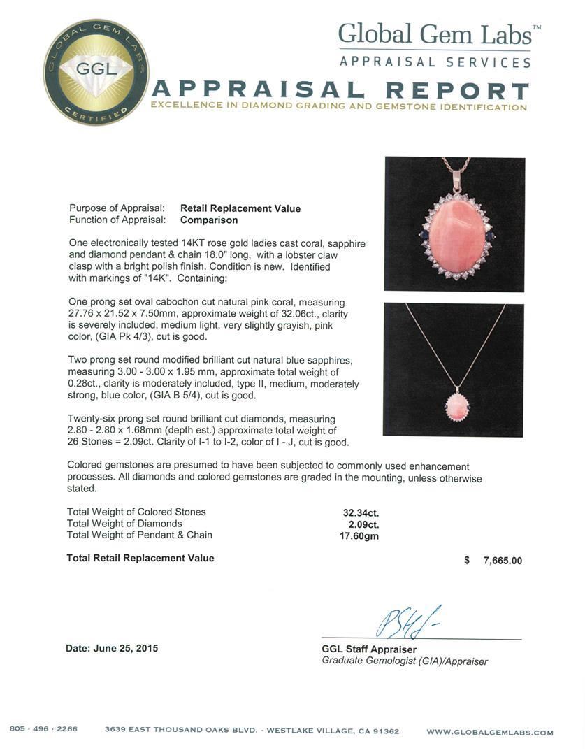 One electronically tested 14KT rose gold ladies cast coral, sapphire and diamond pendant & chain 18.0" long, with a lobster claw clasp with a bright polish finish. Identified with markings of "14K". Condition is new. Containing: One prong set oval cabochon cut natural pink coral, measuring 27.76 x 21.52 x 7.50mm, approximate weight of 32.06ct., clarity is severely included, medium light, very slightly grayish, pink color, (GIA Pk 4/3), cut is good. Two prong set round modified brilliant cut natural blue sapphires, measuring 3.00 - 3.00 x 1.95 mm, approximate. Total Weight of 0.28ct., clarity is moderately included, type II, medium, moderately strong, blue color, (GIA B 5/4), cut is good. Twenty-Six prong set round brilliant cut diamonds, measuring 2.80 - 2.80 x 1.68mm (depth est.) approximate. Total Weight of 26 Stones = 2.09ct. Clarity: I-1 to I-2. Color: I - J, Cut is Good. Colored gemstones are presumed to have been subjected to commonly used enhancement processes. All diamonds and colored gemstones are graded in the mounting, unless otherwise stated. Total Weight of Colored Stones 32.34ct. Total Weight of Diamonds 2.09ct. Total Weight of Pendant & Chain 17.60 grams. GGL Appraised.