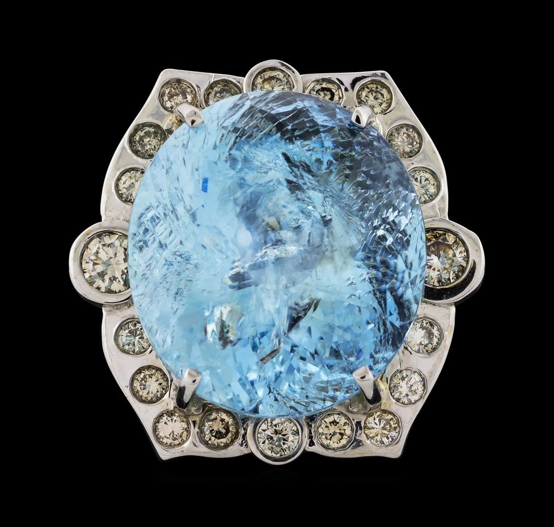One 14KT White Gold Ring with a total weight of 16.30 grams. Containing: Main Gemstones: Identity: Natural Aquamarine, Carat Weight: 32.63 cts tw, Shape & Measurement: Oval Brilliant Cut, Quality: Fine medium color, natural inclusions. Adjacent Gemstones: Identity: Natural Diamond, Shape: Round Cut, Carat Weight: 1.44 cts tw, Quality: SI Clarity, I-J Color. All fine cutting and proportions. Total Gemstones Weight: 34.07 cts tw. RBGS Appraised at $10,000.00.