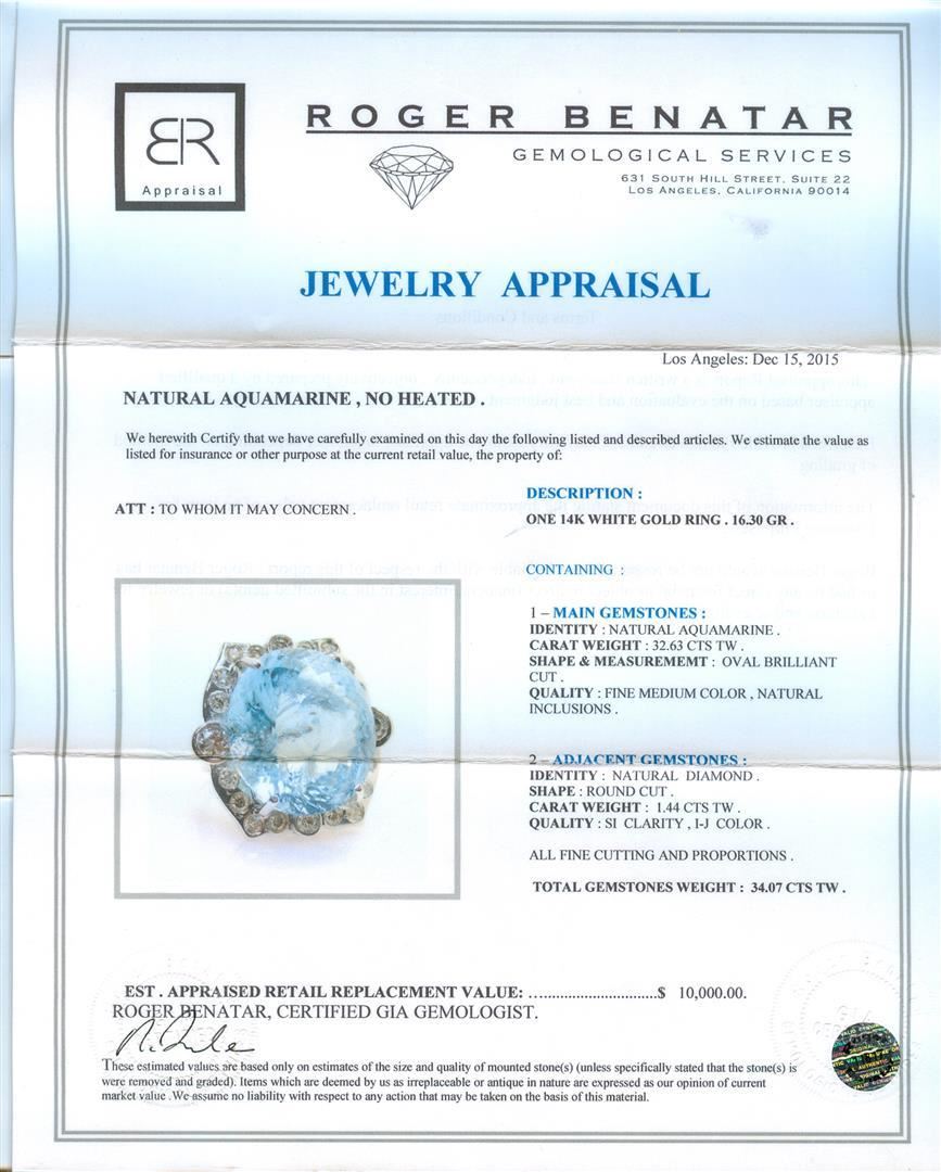 One 14KT White Gold Ring with a total weight of 16.30 grams. Containing: Main Gemstones: Identity: Natural Aquamarine, Carat Weight: 32.63 cts tw, Shape & Measurement: Oval Brilliant Cut, Quality: Fine medium color, natural inclusions. Adjacent Gemstones: Identity: Natural Diamond, Shape: Round Cut, Carat Weight: 1.44 cts tw, Quality: SI Clarity, I-J Color. All fine cutting and proportions. Total Gemstones Weight: 34.07 cts tw. RBGS Appraised.