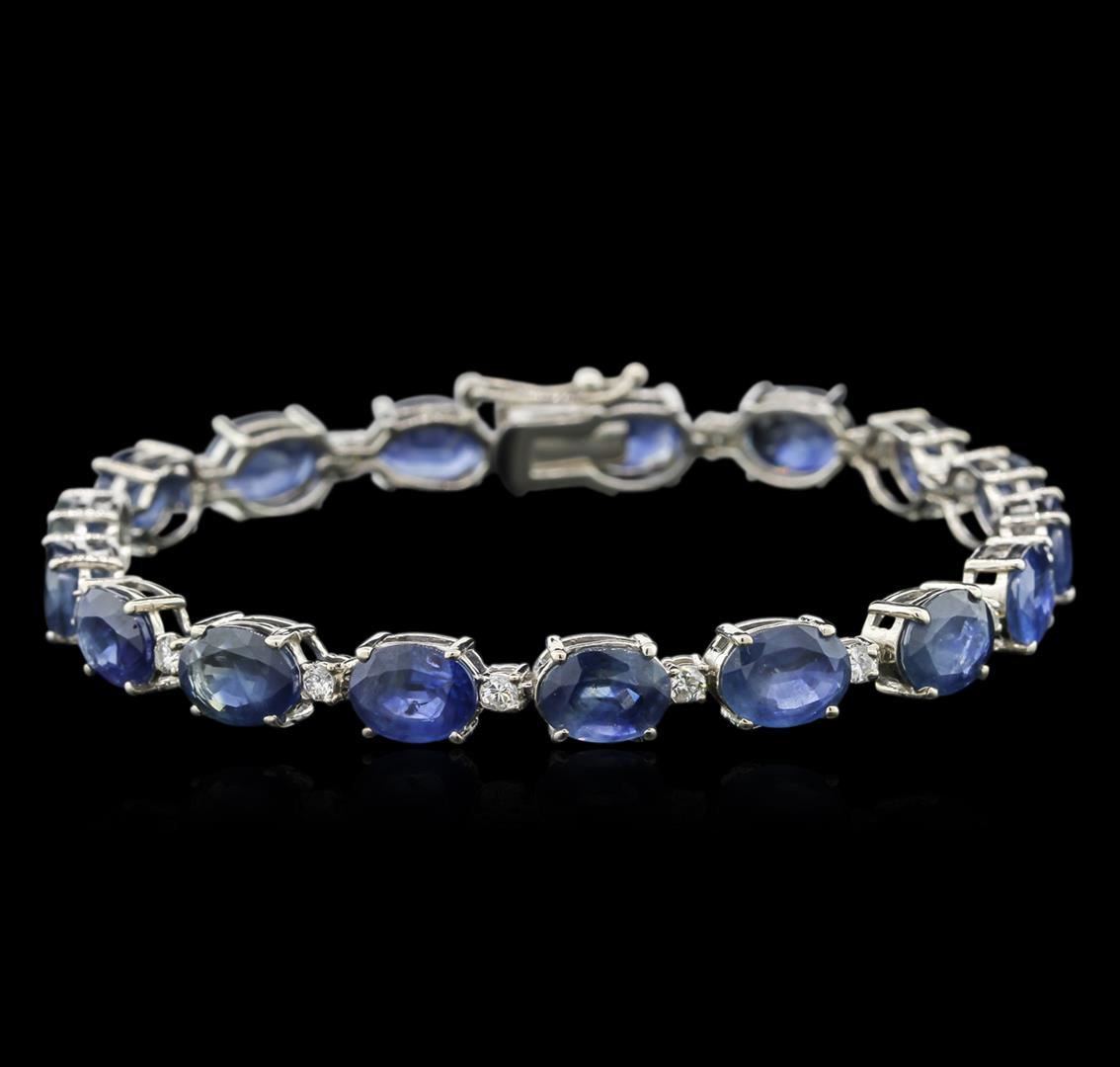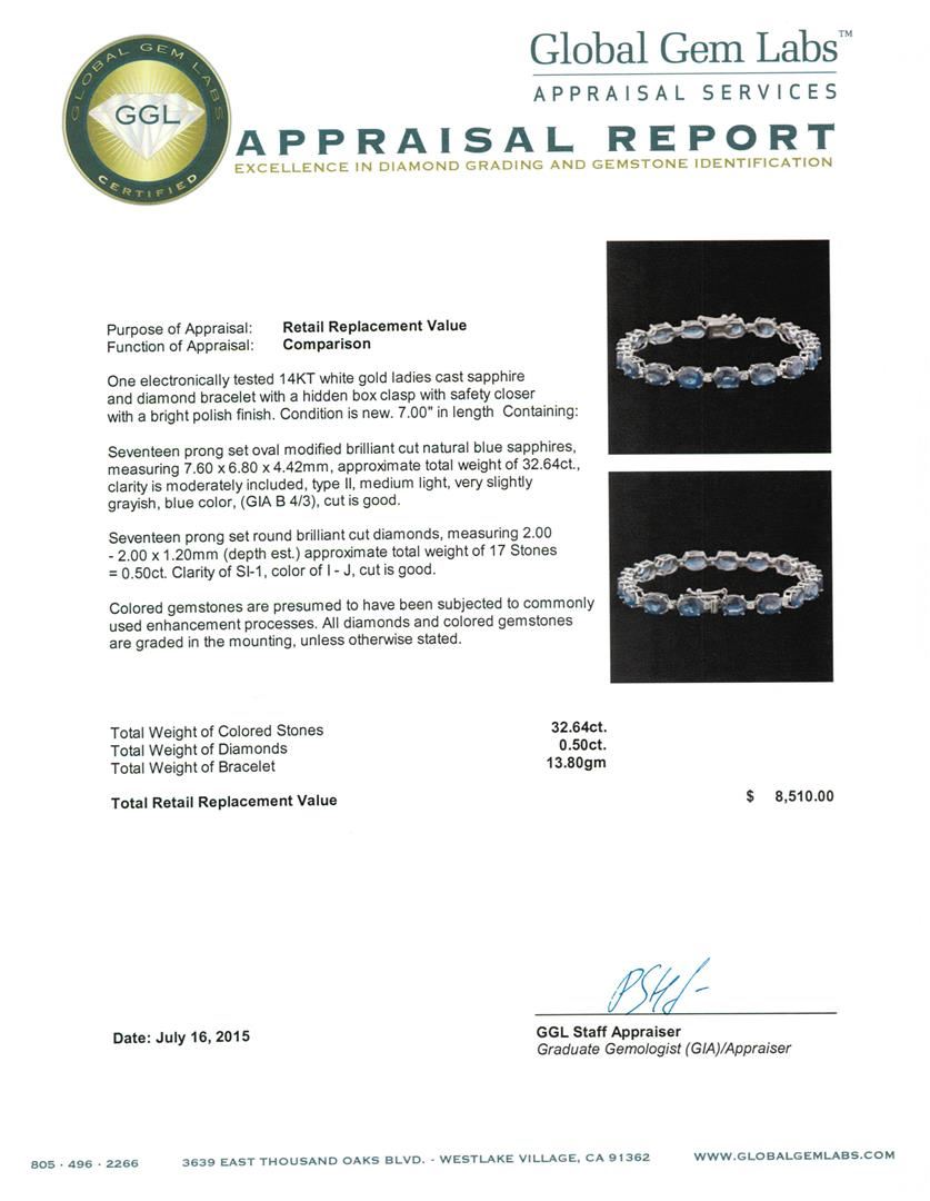 One electronically tested 14KT white gold ladies cast sapphire and diamond bracelet with a hidden box clasp with safety closer with a bright polish finish. 7.00." in length Condition is new. Containing: Seventeen prong set oval modified brilliant cut natural blue sapphires, measuring 7.60 x 6.80 x 4.42mm, approximate total weight of 32.64ct., clarity is moderately included, type II, medium light, very slightly grayish, blue color, (GIA B 4/3), cut is good. Seventeen prong set round brilliant cut diamonds, measuring 2.00 - 2.00 x 1.20mm (depth est.) approximate total weight of 17 Stones = 0.50ct. Clarity: SI-1. Color: I - J, Cut is Good. Colored gemstones are presumed to have been subjected to commonly used enhancement processes. All diamonds and colored gemstones are graded in the mounting, unless otherwise stated. Total Weight of Colored Stones 32.64ct. Total Weight of Diamonds 0.50ct. Total Weight of Bracelet 13.80 grams. GGL Appraised at $8,510.00.