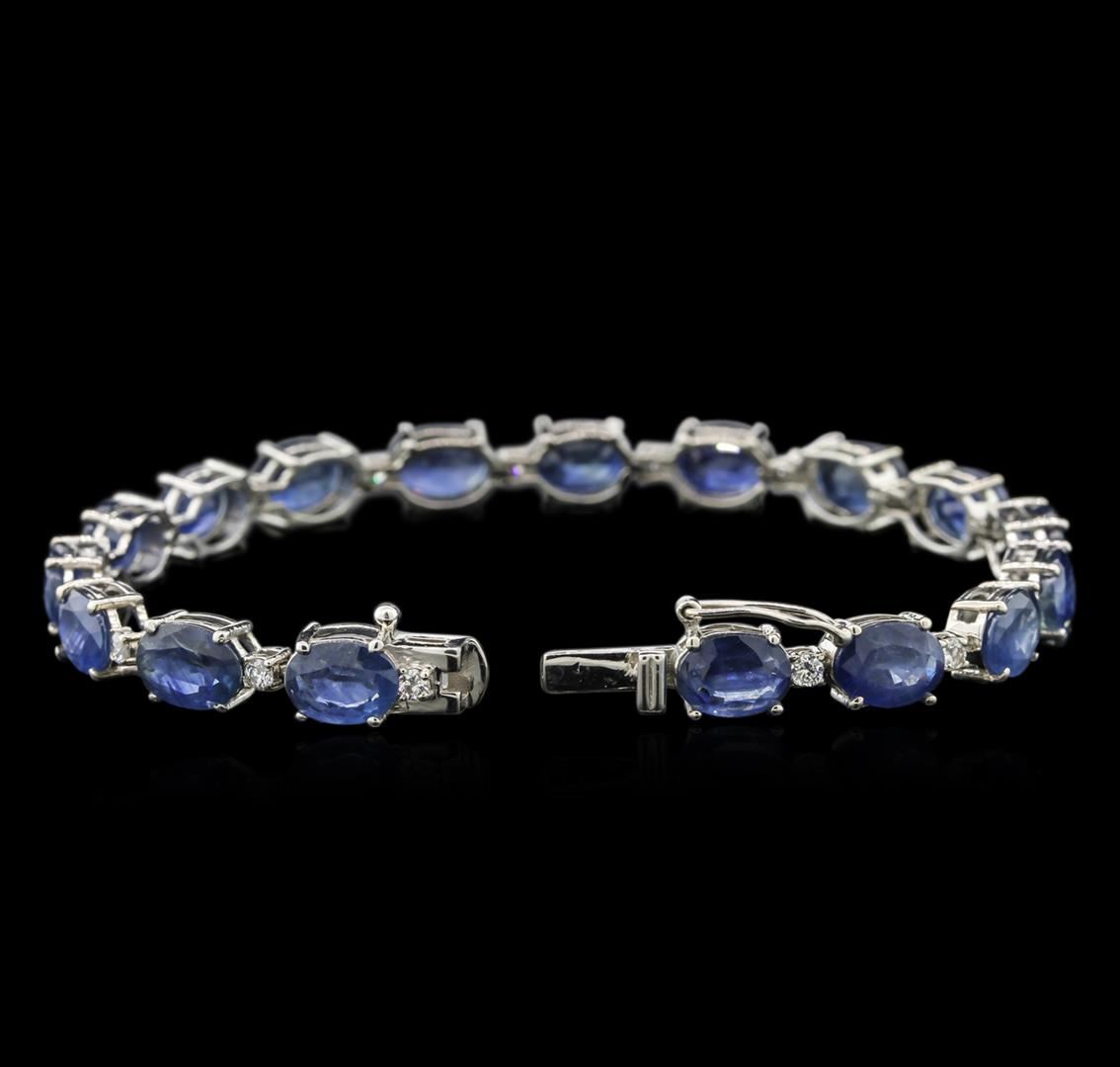 One electronically tested 14KT white gold ladies cast sapphire and diamond bracelet with a hidden box clasp with safety closer with a bright polish finish. 7.00." in length Condition is new. Containing: Seventeen prong set oval modified brilliant cut natural blue sapphires, measuring 7.60 x 6.80 x 4.42mm, approximate total weight of 32.64ct., clarity is moderately included, type II, medium light, very slightly grayish, blue color, (GIA B 4/3), cut is good. Seventeen prong set round brilliant cut diamonds, measuring 2.00 - 2.00 x 1.20mm (depth est.) approximate total weight of 17 Stones = 0.50ct. Clarity: SI-1. Color: I - J, Cut is Good. Colored gemstones are presumed to have been subjected to commonly used enhancement processes. All diamonds and colored gemstones are graded in the mounting, unless otherwise stated. Total Weight of Colored Stones 32.64ct. Total Weight of Diamonds 0.50ct. Total Weight of Bracelet 13.80 grams. GGL Appraised at $8,510.00.