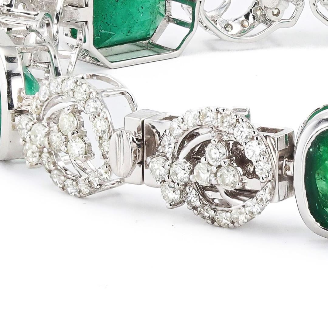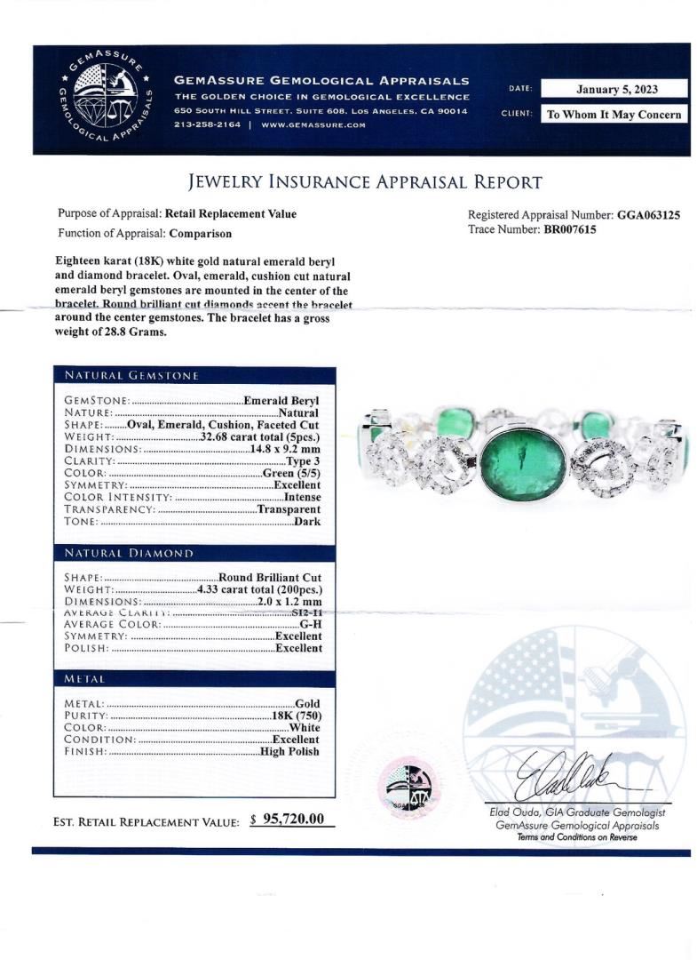 Eighteen karat (18K) white gold natural emerald beryl and diamond bracelet. Oval, emerald, cushion cut natural emerald beryl gemstones are mounted in the center of the bracelet. Round brilliant cut diamonds accent the bracelet around the center gemstones. The bracelet has a gross weight of 28.8 Grams. #NATURAL GEMSTONE# GEMSTONE: Emerald Beryl NATURE: Natural SHAPE: Oval, Emerald, Cushion, Faceted Cut WEIGHT: 32.68 carat total (5pcs.) DIMENSIONS: 14.8 x 9.2mm CLARITY: Type 3 COLOR: Green (5/5) SYMMETRY: Excellent COLOR INTENSITY: Intense TRANSPARENCY: Transparent TONE: Dark #NATURAL DIAMOND# SHAPE: Round Brilliant Cut WEIGHT: 4.33 carat total (200pcs.) DIMENSIONS: 2.0 x 1.2mm AVERAGE CLARITY: SI2-I1 AVERAGE COLOR: G-H SYMMETRY: Excellent POLISH: Excellent #METAL# METAL: Gold PURITY: 18K (750) COLOR: White CONDITION: Excellent FINISH: High Polish #LREF-27182