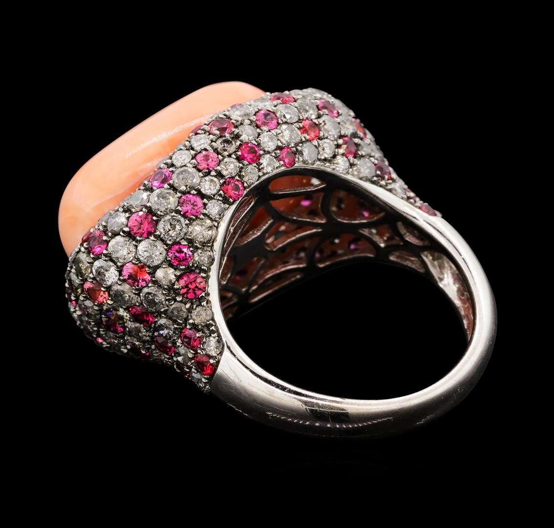 One electronically tested 18KT white & black rhodium plated gold lady's cast fashion ring with a scalloped halo with a bright polish finish. The featured lady's ring has a shank measuring 4.45 millimeters wide. Identified with markings of '18K 750'. Condition is new, good workmanship. Containing: One bezel set free-form cabochon cut natural salmon coral, measuring 20.50 x 16.05 x 11.50mm, (depth est.) 10%. bulge factor, approximate weight of 29.75ct., medium light, moderately strong, orangy red color, (GIA oR 4/4), cut is good. Colored gemstones are presumed to have been subjected to commonly used enhancement processes. Graded in the setting. Seventy-four prong set round modified brilliant cut natural pink sapphires, measuring 2.00 - 1.70 x 1.20 mm, (depth est.) approximate total weight of 3.00ct., clarity is eye clean, medium, moderately strong, slightly purplish red color, (GIA slpR 5/4), cut is very good. Transmitting light with no distortion, transparent. Colored gemstones are presumed to have been subjected to commonly used enhancement processes. Graded in the setting. One Hundred Thirty-Nine prong set round brilliant cut diamonds, measuring 2.00 - 1.50 x 1.09mm (depth est.) approximate total weight of 139 Stones = 2.75ct. Graded in the setting. Color J - K Clarity I-1 to I-2 Cut Good. Total Weight of Colored Stones 32.75ct.. Total Weight of Diamonds 2.75ct.. Total Weight of Ring 17.60gm GAS Appraised at $5,835.00.