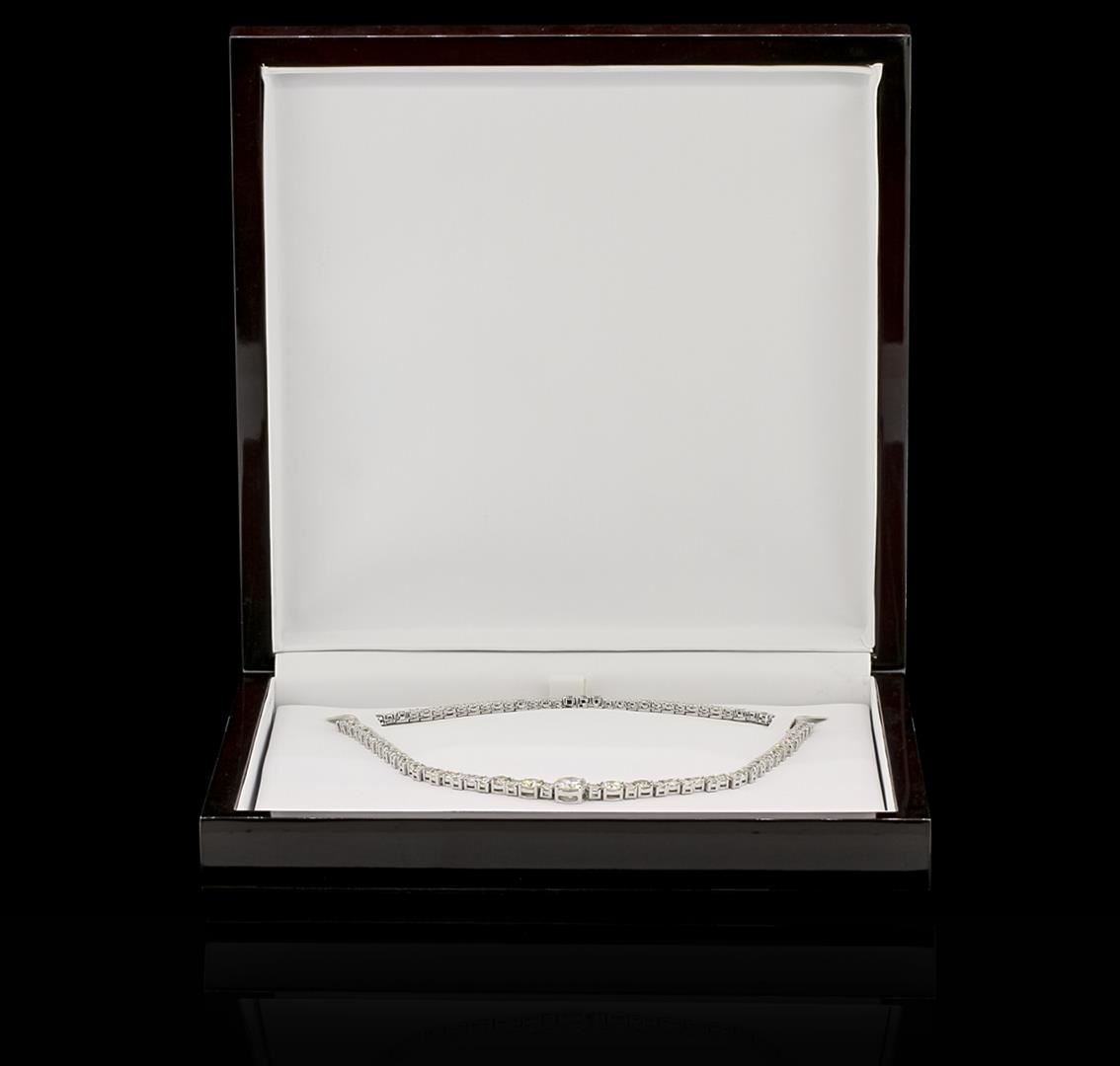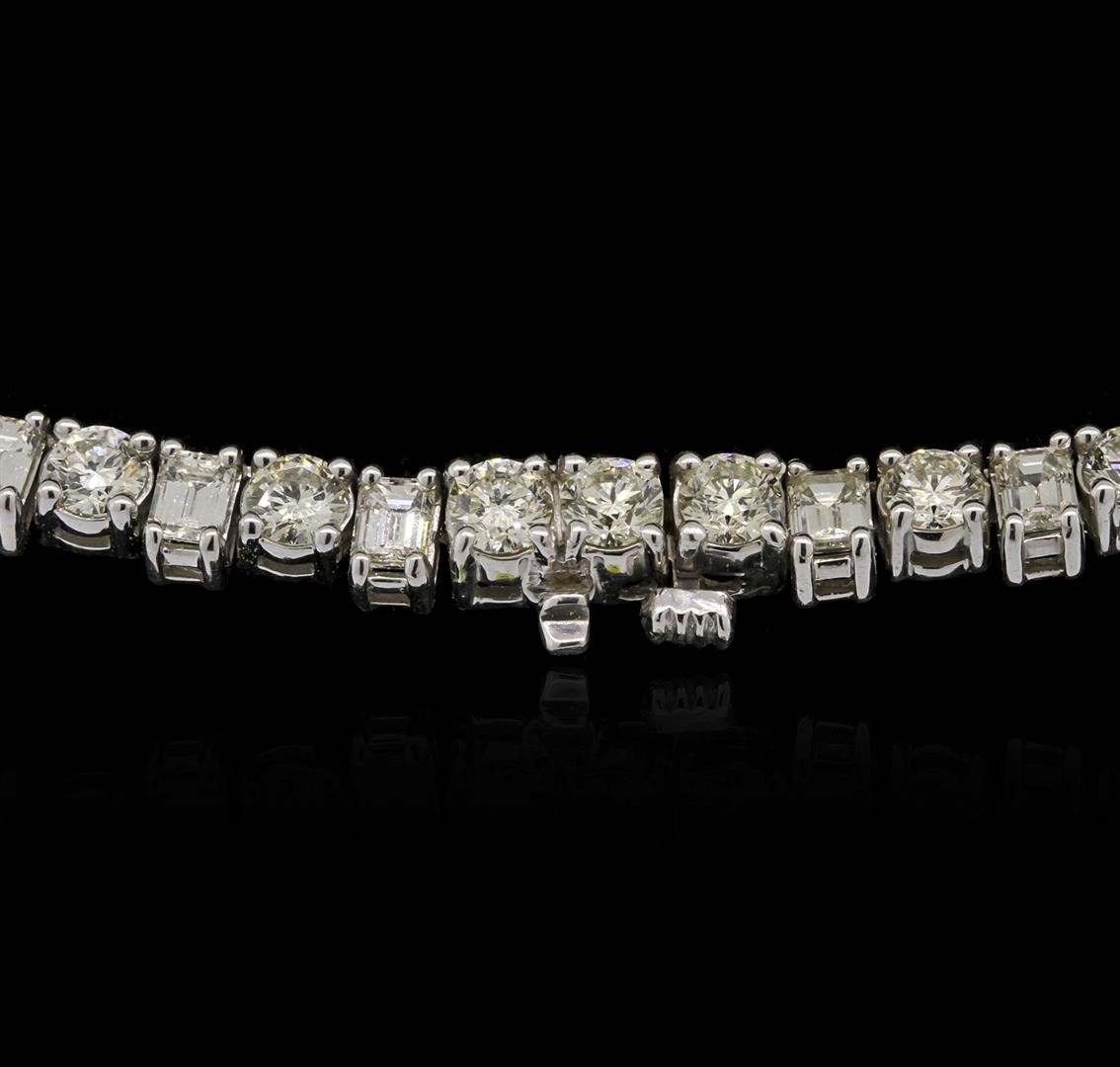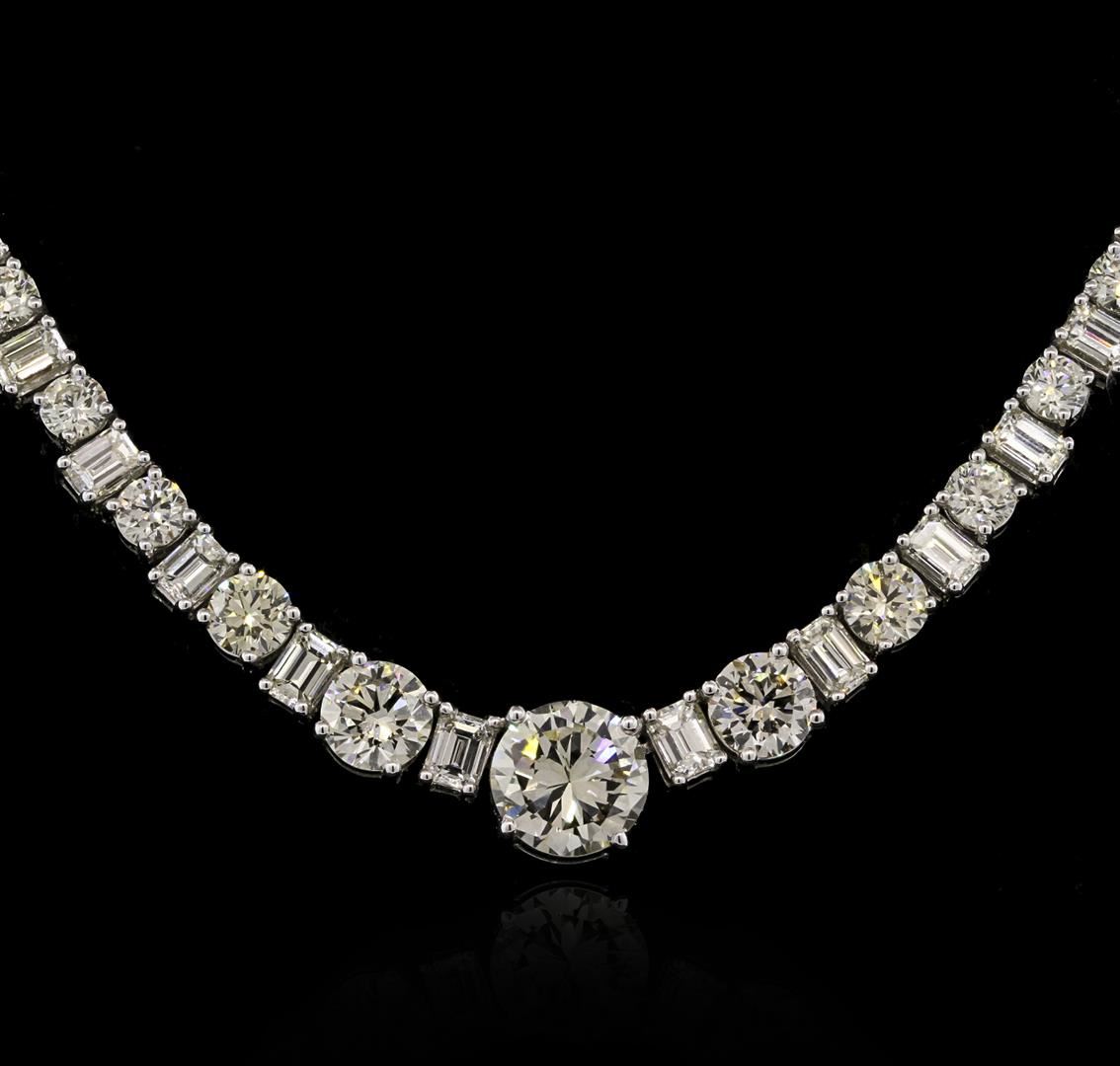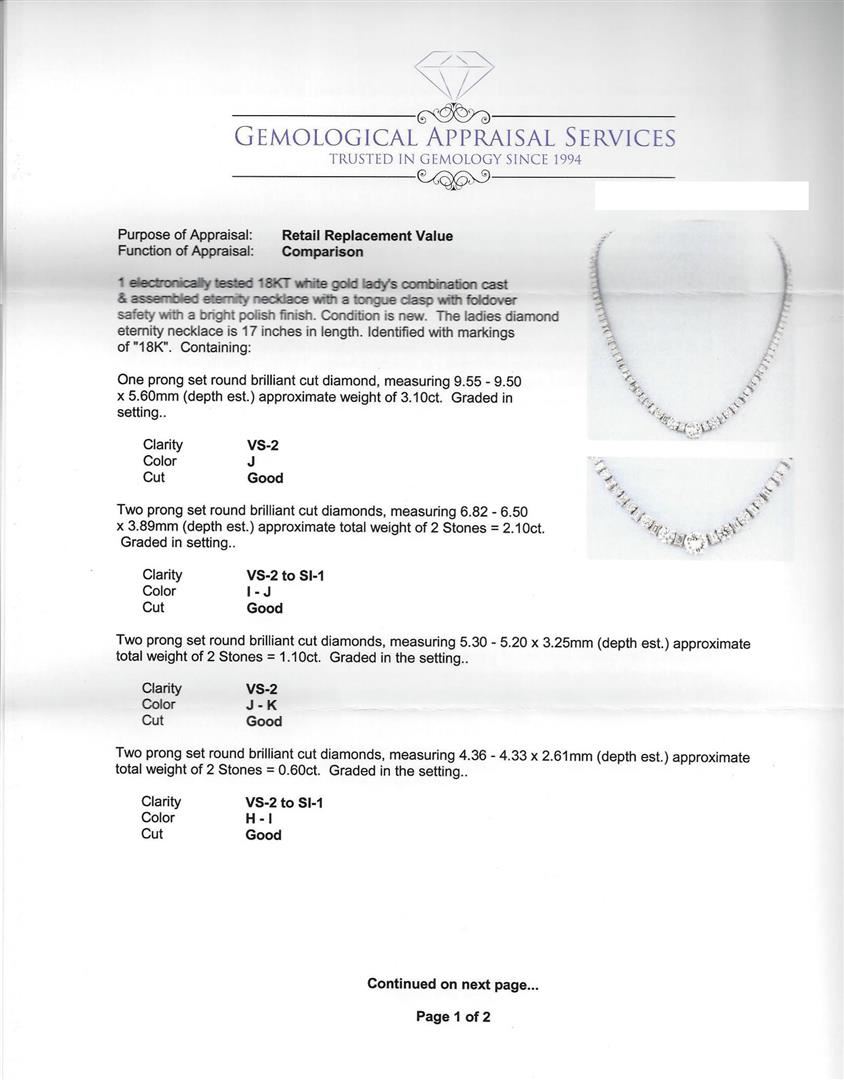 One electronically tested 18KT white gold lady's combination cast & assembled eternity necklace with a tongue clasp with foldover safety with a bright polish finish. Condition is new. The ladies diamond eternity necklace is 17 inches in length. Identified with markings of "18K". Containing: One prong set round brilliant cut diamond, measuring 9.55 - 9.50 x 5.60mm (depth est.) approximate weight of 3.10ct. Graded in setting. Clarity: VS-2. Color: J. Cut: Good. Two prong set round brilliant cut diamonds, measuring 6.82 - 6.50 x 3.89mm (depth est.) approximate total weight of 2 Stones = 2.10ct. Graded in setting. Clarity: VS-2 to SI-1. Color: I - J. Cut: Good. Two prong set round brilliant cut diamonds, measuring 5.30 - 5.20 x 3.25mm (depth est.) approximate total weight of 2 Stones = 1.10ct. Graded in the setting. Clarity: VS-2. Color: J - K. Cut: Good. Two prong set round brilliant cut diamonds, measuring 4.36 - 4.33 x 2.61mm (depth est.) approximate total weight of 2 Stones = 0.60ct. Graded in the setting. Clarity: VS-2 to SI-1. Color: H - I. Cut: Good. Forty-nine prong set round brilliant cut diamonds, measuring 4.25 - 3.80 x 2.42mm (depth est.) approximate total weight of 49 Stones = 11.75ct. Graded in the setting. Clarity: VS-2 to SI-2. Color: H - J. Cut: Good. Fifty-four prong set square emerald cut diamonds, measuring 4.50 x 3.30 x 2.20mm (depth est.) approximate total weight of 54 Stones = 14.11ct. Graded in the setting. Clarity: VS-2 to SI-2. Color: H - I. Cut: Very Good. Total Weight of Diamonds: 32.76ct. Total Weight of Necklace: 44.00 gm. GAS Appraised at $201,515.00.