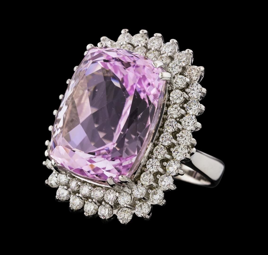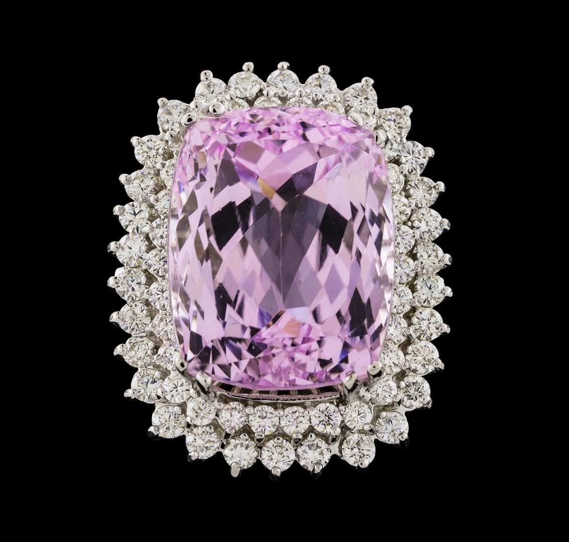 One 14KT White Gold Lady's Ring. Containing: Gold & Weight: 14K White Gold, 18.14 grams. Main Gemstones: Identity: Natural Kunzite. Carat Weight: 32.78 cts tw. Shape & Measurement: Cushion Cut. Approx: 19.85 x 15.56 mm. Quality: Fine Quality. No Heat. Pakistan Origin. Adjacent Gemstones: Identity: Natural Diamond. Shape: Round Brilliant Cut. Carat Weight: 2.77 cts tw. Quality: All VS Clarity, E-F Color. All fine cutting and proportions. Total gemstones weight: 35.55 cts tw. RBGS Appraised at $19,000.00.