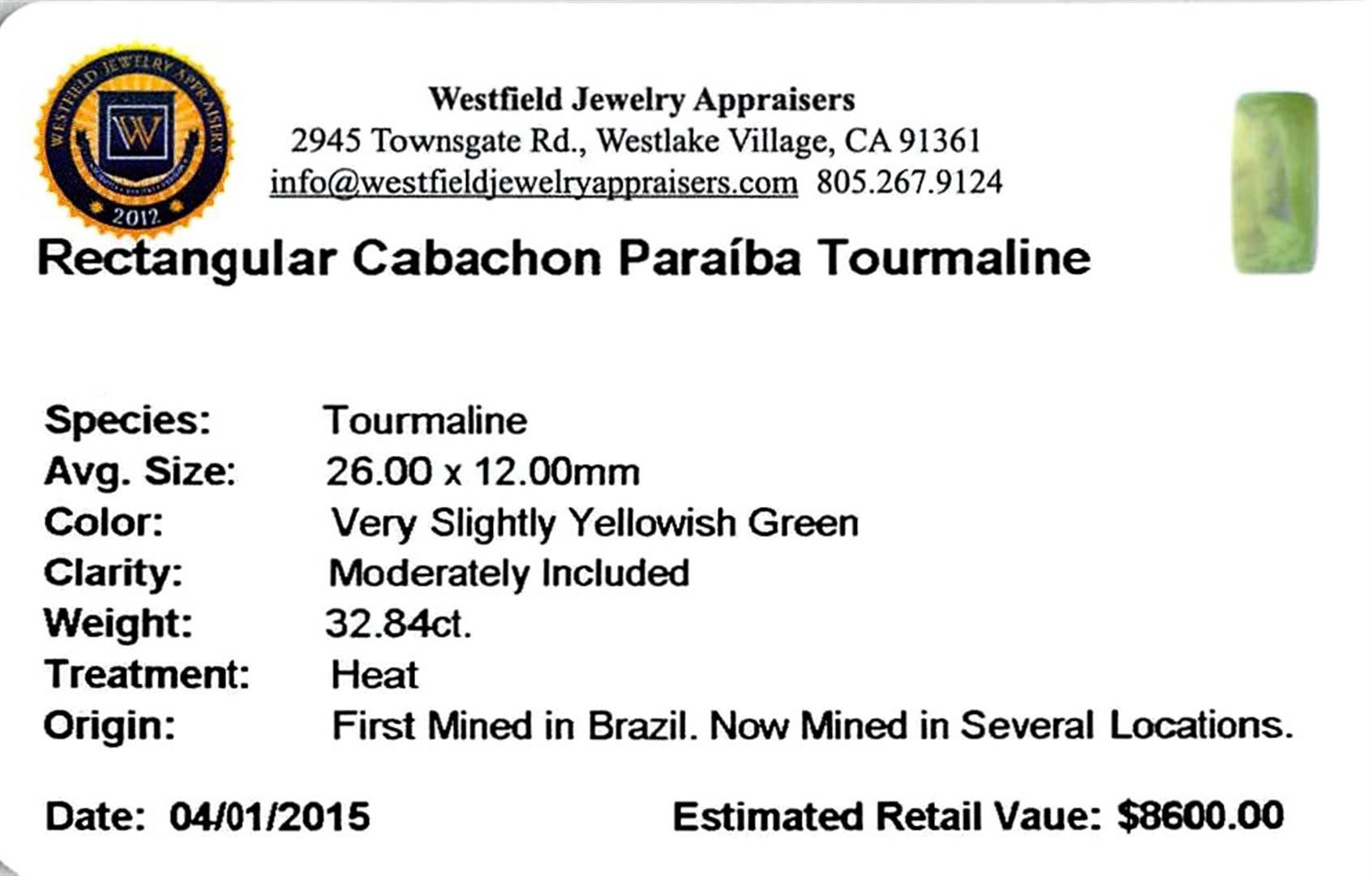 One rectangular cabochon cut natural Paraiba tourmaline exact weight 32.84ct., clarity is moderately included, cut is good. Westfield Appraised at $8,600.00.
