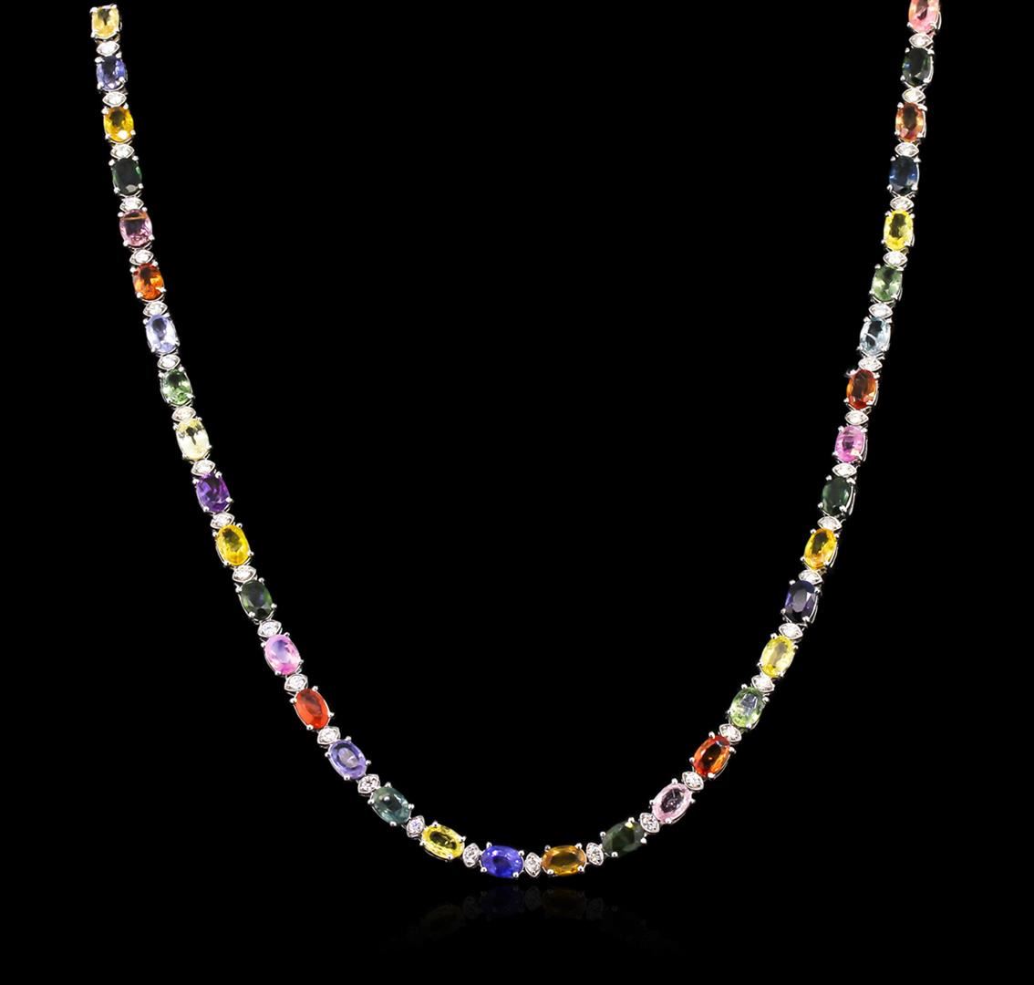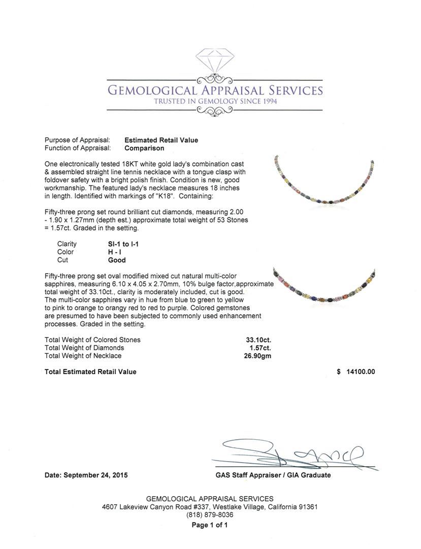 One electronically tested 18KT white gold lady's combination cast & assembled straight line tennis necklace with a tongue clasp with foldover safety with a bright polish finish. The featured lady's necklace measures 18 inches in length. Identified with markings of "K18". Condition is new, good workmanship. Containing: Fifty-Three prong set round brilliant cut diamonds, measuring 2.00 - 1.90 x 1.27mm (depth est.) approximate total weight of 53 Stones = 1.57ct. Graded in the setting. Clarity: SI-1 to I-1. Color: H - I. Cut Good Fifty-three prong set oval modified mixed cut natural multi-color sapphires, measuring 6.10 x 4.05 x 2.70mm, 10% bulge factor, approximate total weight of 33.10ct., clarity is moderately included, cut is good. The multi-color sapphires vary in hue from blue to green to yellow to pink to orange to orangy red to red to purple. Colored gemstones are presumed to have been subjected to commonly used enhancement processes. Graded in the setting. Total Weight of Colored Stones 33.10ct. Total Weight of Diamonds 1.57ct. Total Weight of Necklace 26.90gm at $14100.00.. GAS Appraised at $14,100.00.