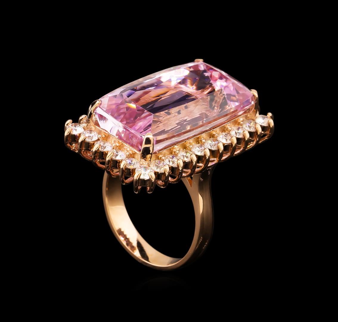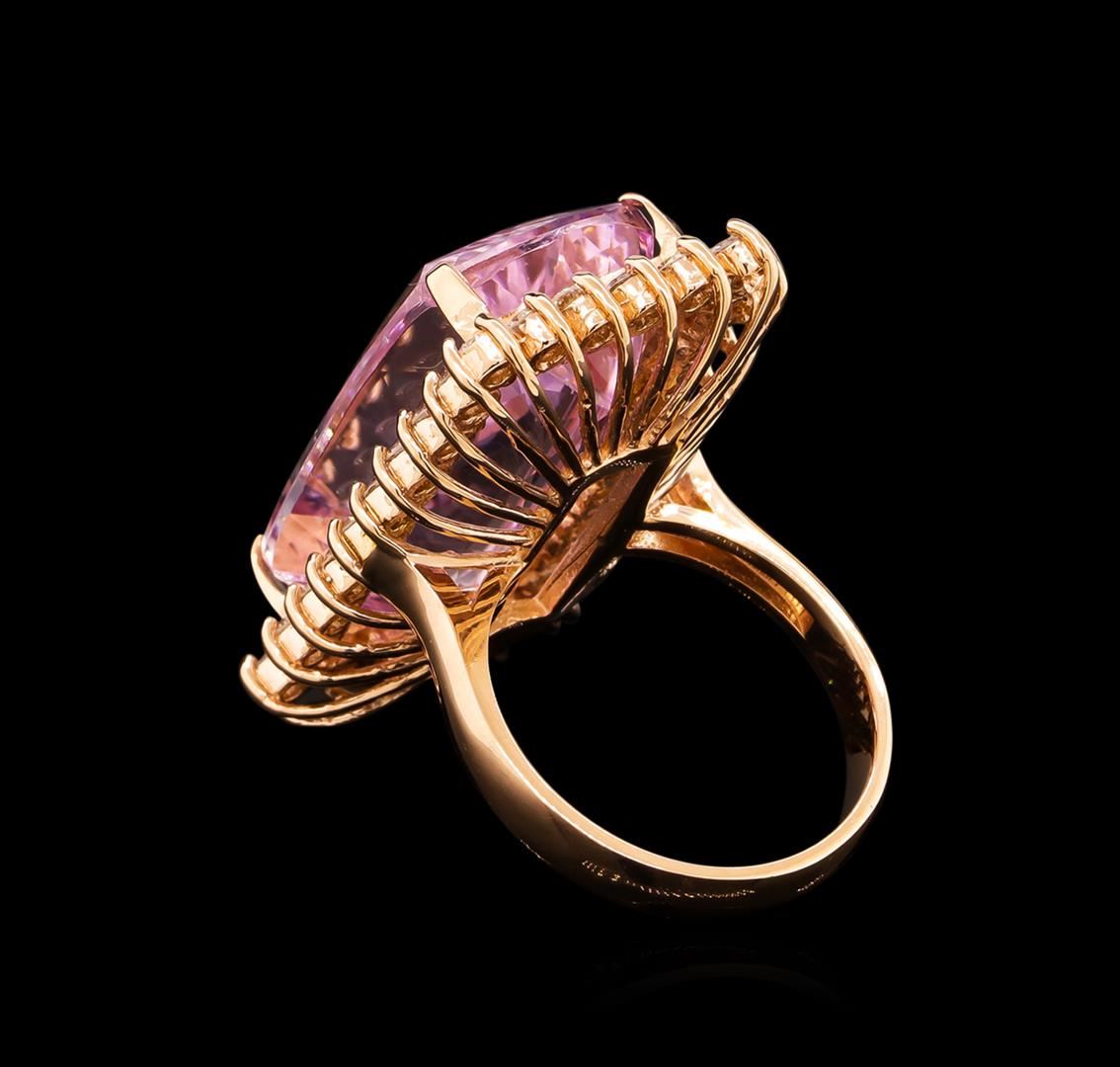 One electronically tested 14KT rose gold lady's cast fashion ring with a basket halo with a bright polish finish. The featured lady's ring has a shank measuring 3.74 millimeters wide. Identified with markings of "K14". Condition is new, good workmanship. Containing: One prong set rectangular cushion modified brilliant cut natural kunzite, measuring 24.55 x 14.23 x 10.41mm, 20%. bulge factor, approximate weight of 33.11ct., clarity is eye clean, type I, medium light, moderately strong, purple red color, (GIA PR 4/4), cut is very good. Transmitting light with no distortion, transparent. Colored gemstones are presumed to have been subjected to commonly used enhancement processes. Graded in the setting. Twenty-Eight prong set round brilliant cut diamonds, measuring 2.80 - 2.70 x 1.71mm (depth est.) approximate total weight of 28 Stones = 2.20ct. Graded in the setting. Clarity: SI-1 to SI-2. Color: H - I. Cut Good. Total Weight of Colored Stones 33.11ct. Total Weight of Diamonds 2.20ct. Total Weight of Ring 17.20gm. GAS Appraised at $19,485.00.