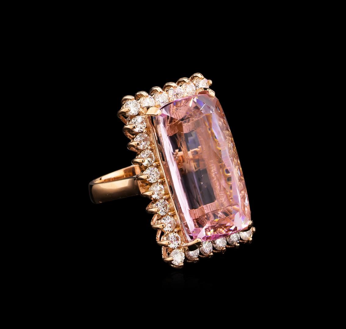 One electronically tested 14KT rose gold lady's cast fashion ring with a basket halo with a bright polish finish. The featured lady's ring has a shank measuring 3.74 millimeters wide. Identified with markings of "K14". Condition is new, good workmanship. Containing: One prong set rectangular cushion modified brilliant cut natural kunzite, measuring 24.55 x 14.23 x 10.41mm, 20%. bulge factor, approximate weight of 33.11ct., clarity is eye clean, type I, medium light, moderately strong, purple red color, (GIA PR 4/4), cut is very good. Transmitting light with no distortion, transparent. Colored gemstones are presumed to have been subjected to commonly used enhancement processes. Graded in the setting. Twenty-Eight prong set round brilliant cut diamonds, measuring 2.80 - 2.70 x 1.71mm (depth est.) approximate total weight of 28 Stones = 2.20ct. Graded in the setting. Clarity: SI-1 to SI-2. Color: H - I. Cut Good. Total Weight of Colored Stones 33.11ct. Total Weight of Diamonds 2.20ct. Total Weight of Ring 17.20gm. GAS Appraised at $19,485.00.