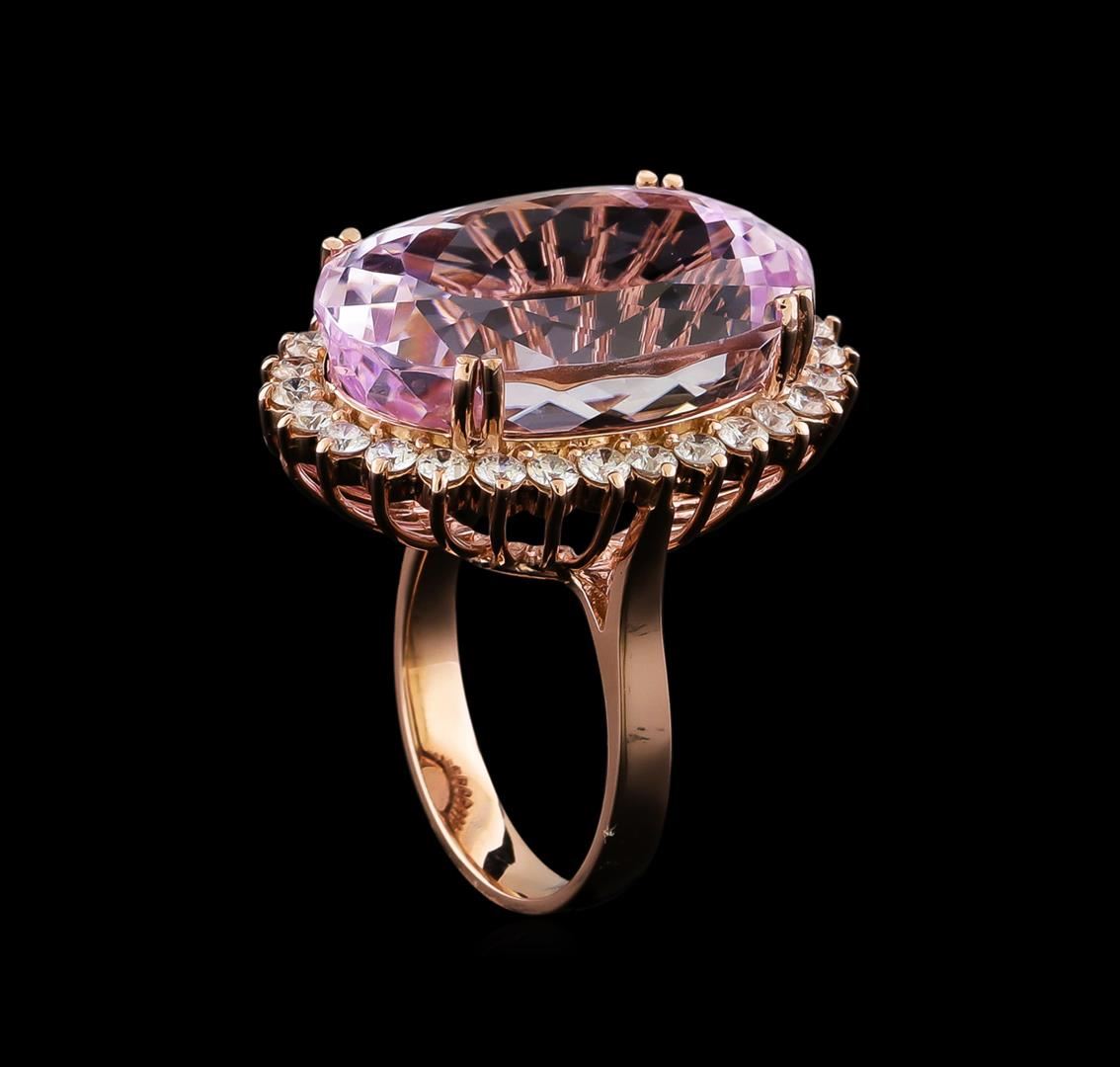 One electronically tested 14KT rose gold lady's cast fashion ring with a basket halo with a bright polish finish. The featured lady's ring has a shank measuring 3.45 millimeters in width. Identified with markings of "K14". Condition is new, good workmanship. Containing: One prong set oval modified brilliant cut natural kunzite, measuring 23.10 x 15.65 x 11.49mm, (depth est.) 10%. bulge factor, approximate weight of 33.17ct., clarity is eye clean, medium light, moderately strong, purple red color, (GIA PR 4/4), cut is very good. Transmitting light with no distortion, transparent. Colored gemstones are presumed to have been subjected to commonly used enhancement processes. Graded in the setting. Twenty-Eight prong set round brilliant cut diamonds, measuring 2.40 - 2.30 x 1.46mm (depth est.) approximate total weight of 28 Stones = 1.40ct. Graded in the setting. Clarity: SI-1 to SI-2. Color: H - I. Cut Good. Total Weight of Colored Stones 33.17ct. Total Weight of Diamonds 1.40ct. Total Weight of Ring 14.90gm. GAS Appraised at $14,970.00.